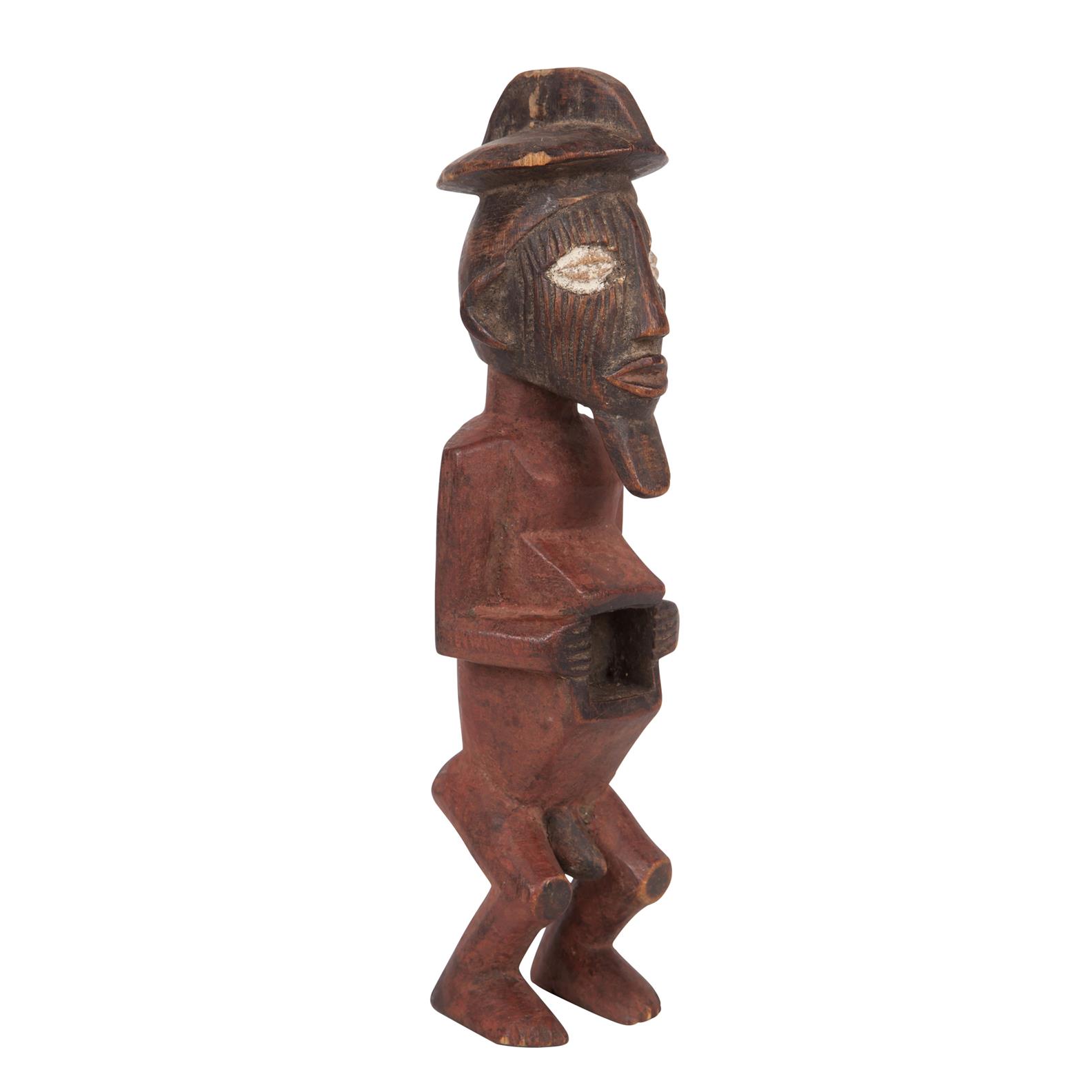 African Republic of Congo, standing with the geometric formed legs flexed, the hands on the protruding stomach which contained the fetish material, well patinated.