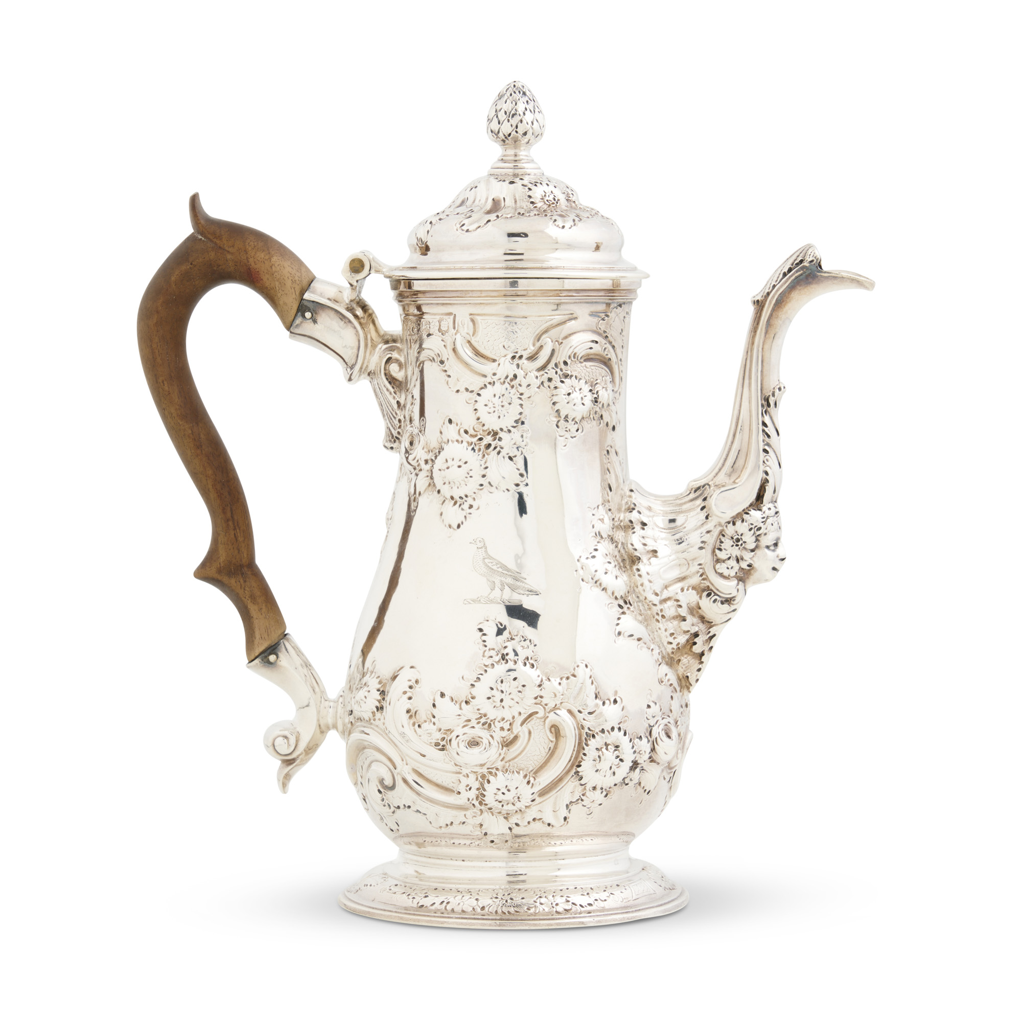 Of baluster shape with scrolling hardwood handle on a circular foot, the domed cover with cone finial, the cover, body, and foot worked in relief with flowers and foliage, and the base of the spout with the head of a man, engraved to one side with a crest of a dove
