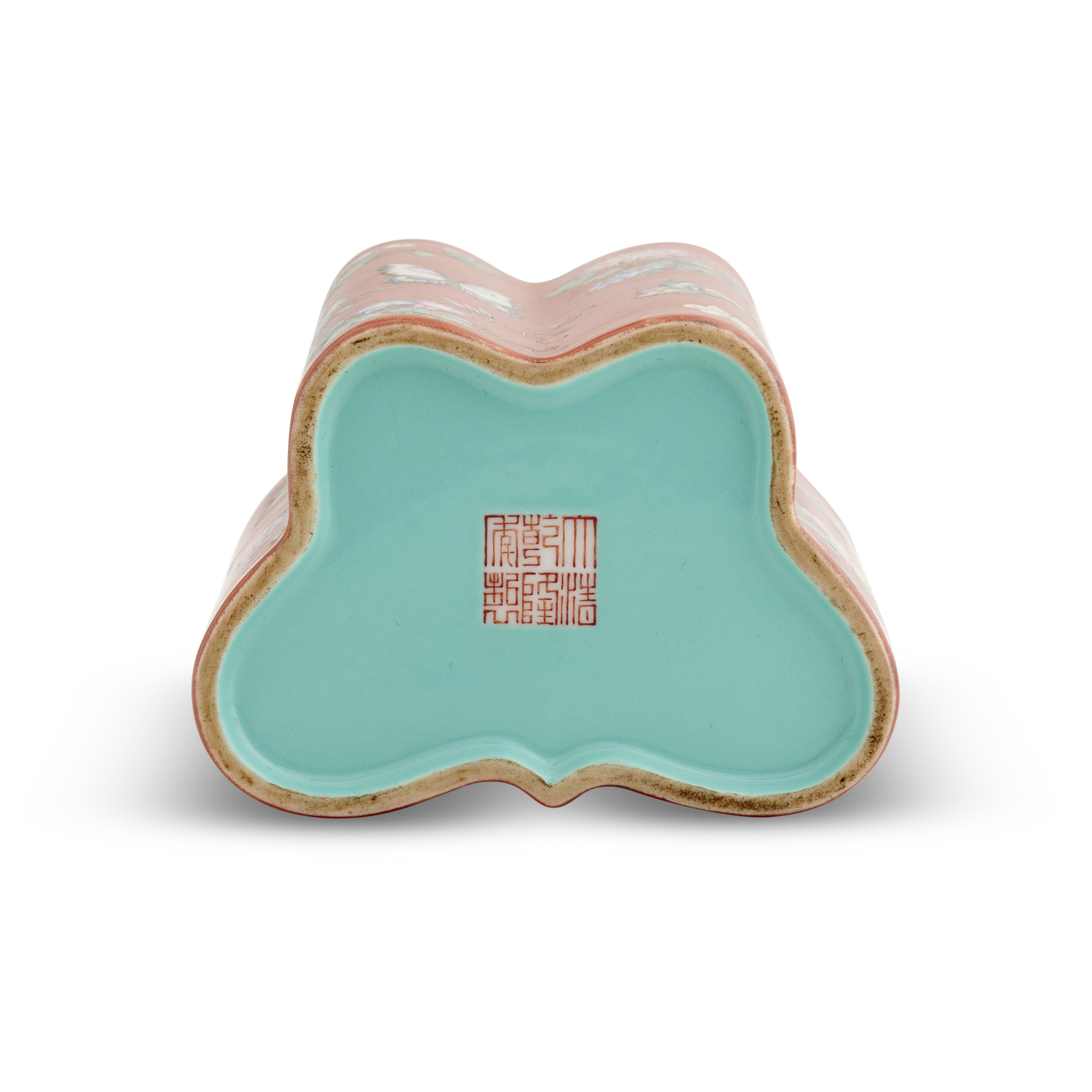 A CHINESE RUBY RED GROUND FAMILLE-ROSE BUTTERFLY FORMED BRUSH POT, QIANLONG SIX-CHARACTER IRON RED SEAL MARK, LATE 19TH / EARLY 20TH CENTURY