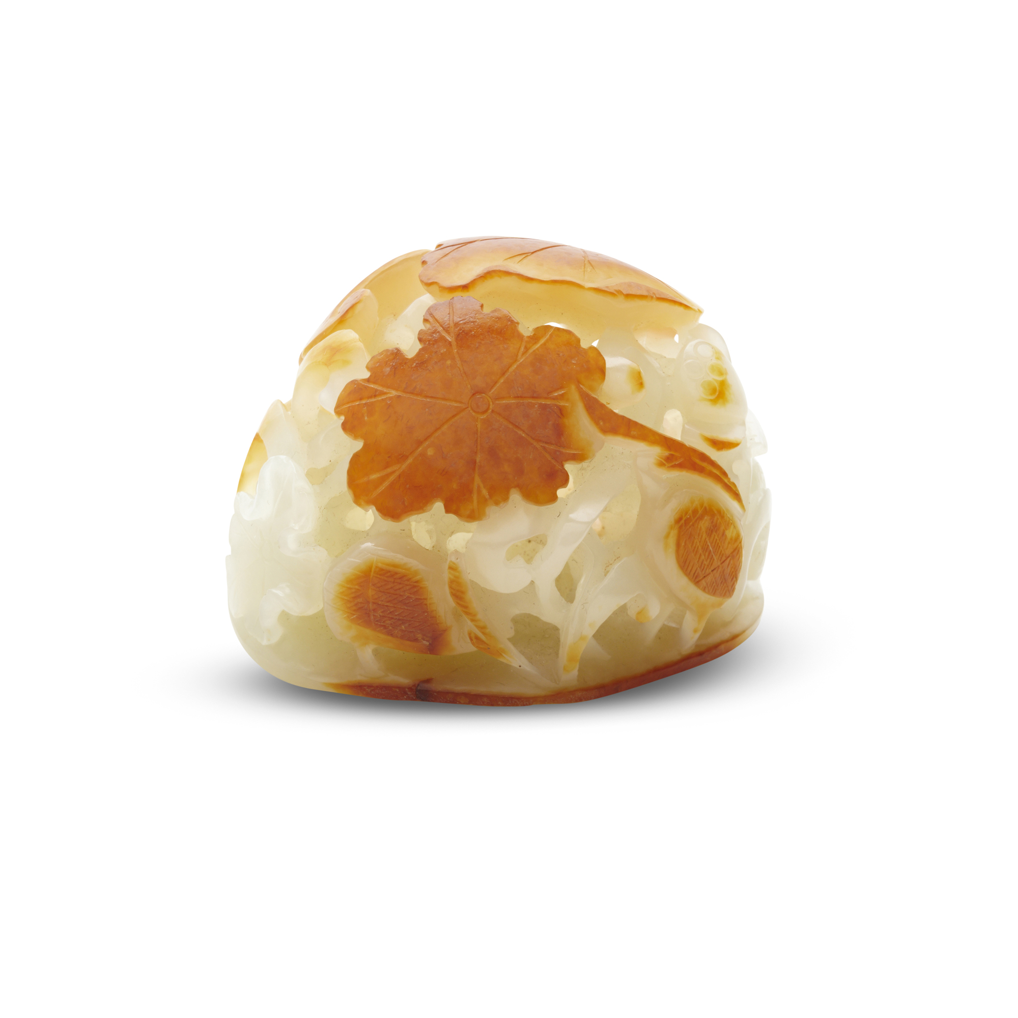 A CHINESE WHITE AND RUSSET JADE OPENWORK CENSER COVER FINIAL, JIN/YUAN DYNASTY, 12TH-14TH CENTURY