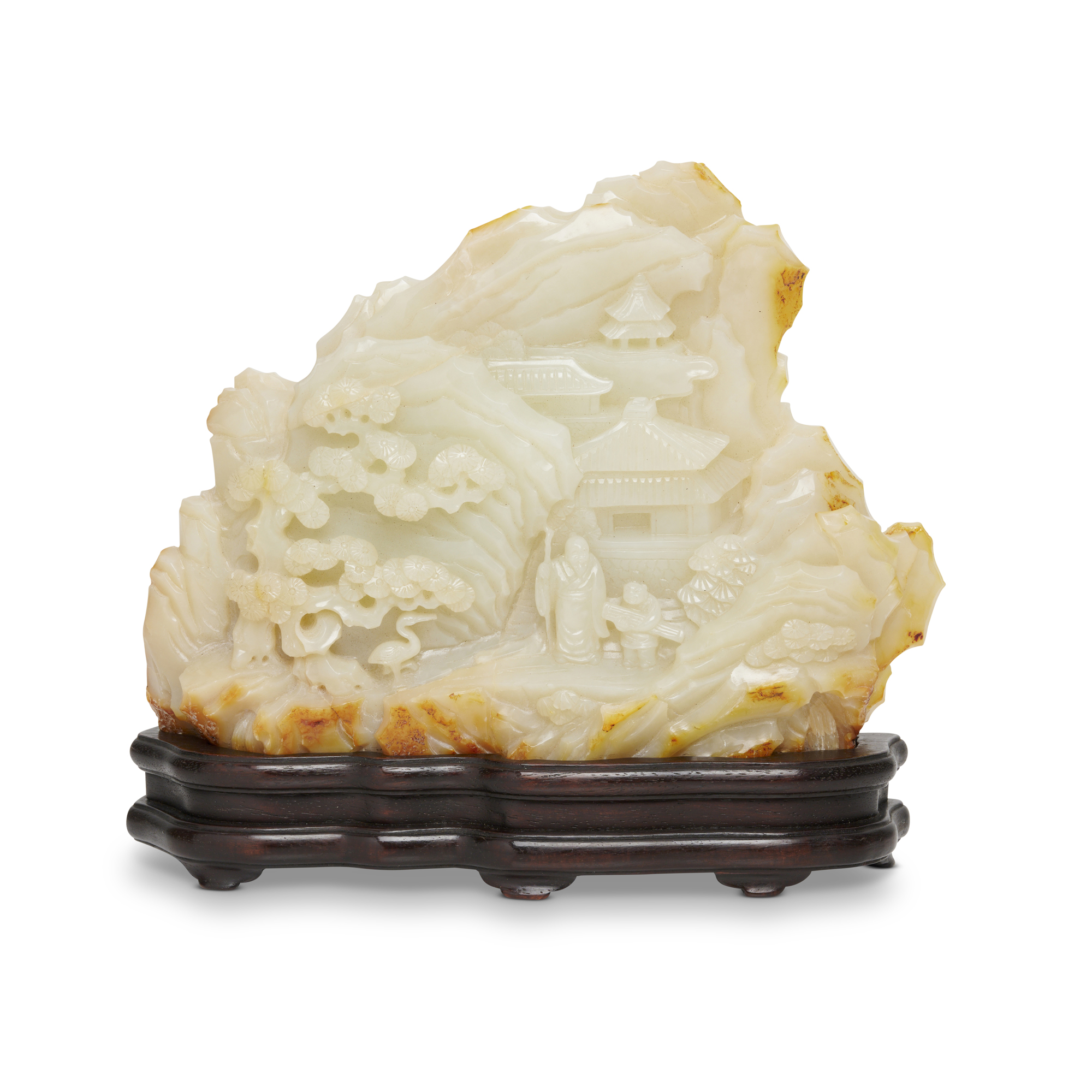 A CHINESE CARVED WHITE AND RUSSET JADE MOUNTAIN BOULDER, QING DYNASTY (1644 - 1911)