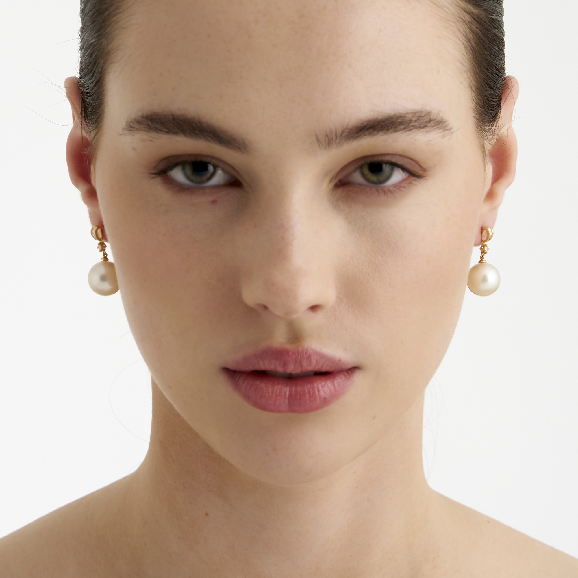 Each earring featuring a round pearl of white hues measuring approximately 13.3mm, suspended below a single claw-set round brilliant-cut diamond and a tapered surmount detailed with baguette-cut diamonds, the diamonds together weighing approximately 0.18cts, to post and butterfly fittings, length 30mm.