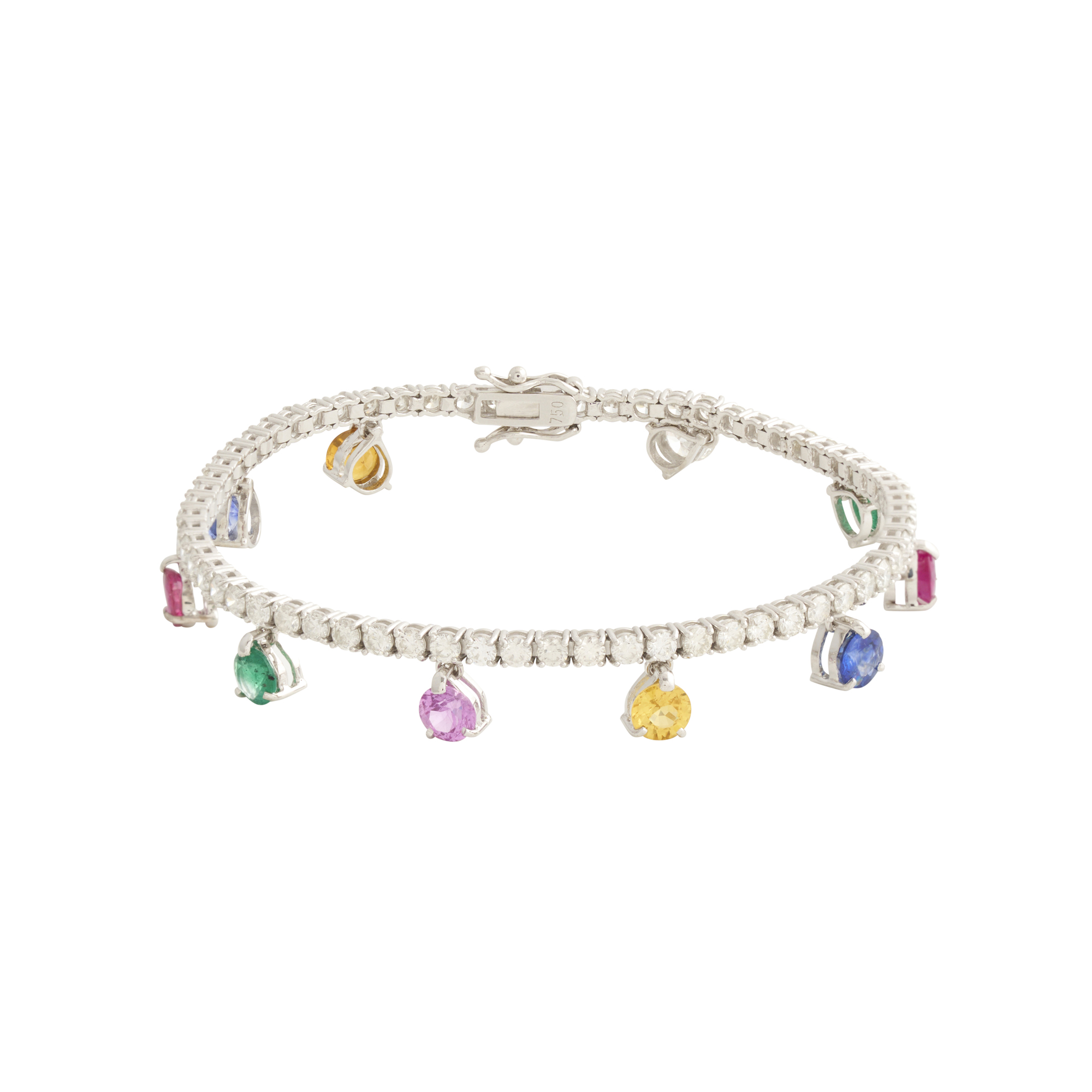 Modelled as a continuous line of claw-set round brilliant-cut diamonds, suspending at intervals claw-set circular-cut a rubies, emeralds, sapphires, pink sapphires, yellow sapphires and orange sapphires, the diamonds together weighing 4.88 carats, completed by a tongue and groove clasp, length 185mm, gross weight approximately 12.5 grams.