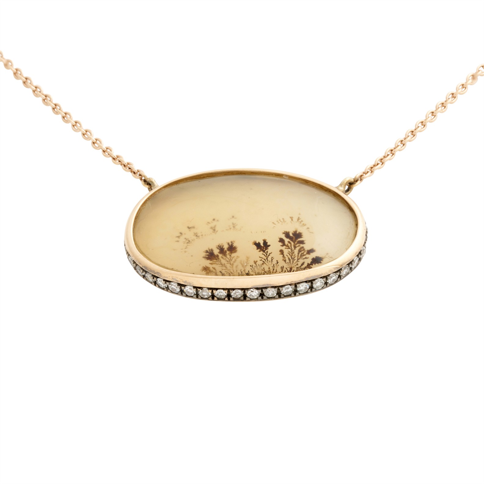 Centring a bezel-set polished oval moss agate, the mount detailed with bead-set single-cut diamonds together weighing approximately 0.25 carats, to an integral chain completed by a bolt-ring clasp, length 420mm, gross weight approximately 4.7 grams.