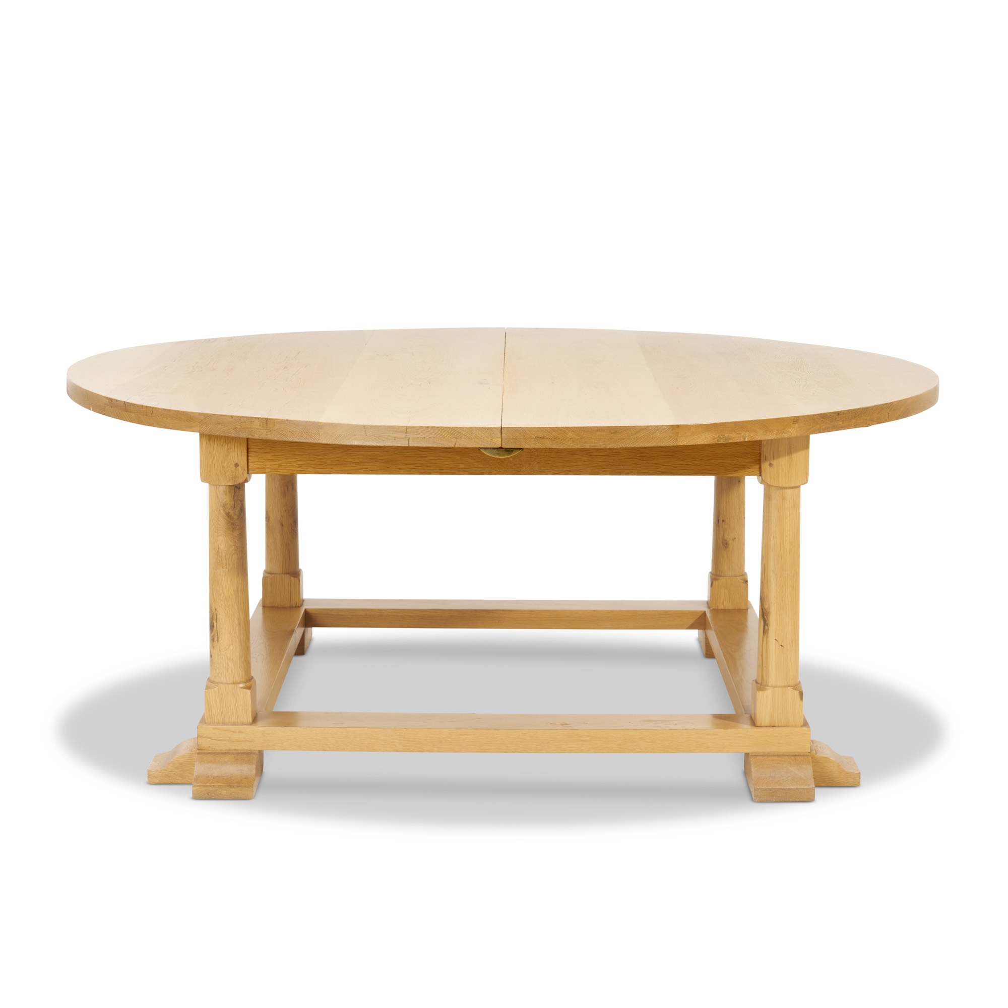 In Arts and Crafts manner, the top with rounded ends (circular when not extended) raised on columnar supports joined with low peripheral stretchers on sled feet, with two spare leaves, Kim Moir's brass label applied to the underside