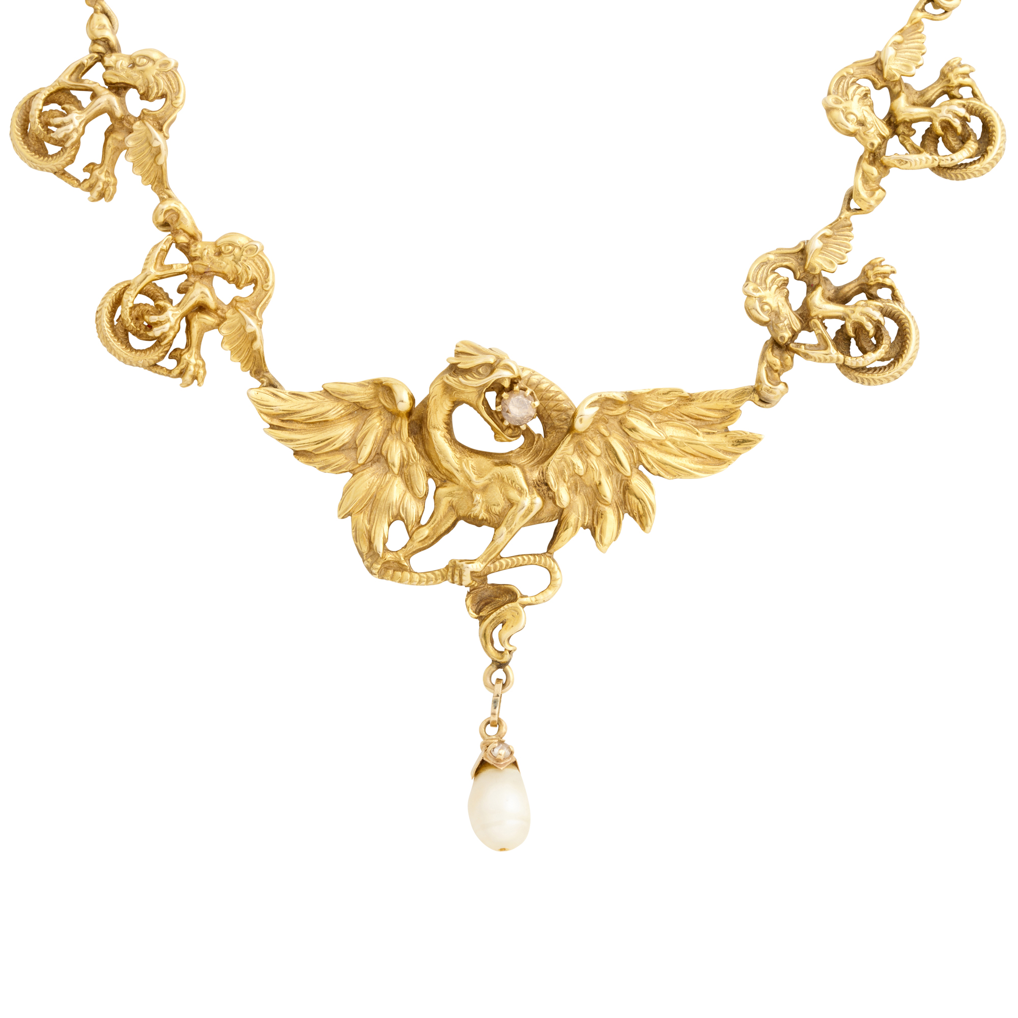 Centring a Wyvern dragon, holding in it's mouth a claw-set round brilliant-cut champagne diamond, the tail suspending an elongated pearl of white hues measuring approximately 9.60mm by 7.80mm, to a diamond-set surmount, the diamonds together weighing approximately 0.30 carats, to a collar of repeated dragon motif links, completed by a hook clasp,