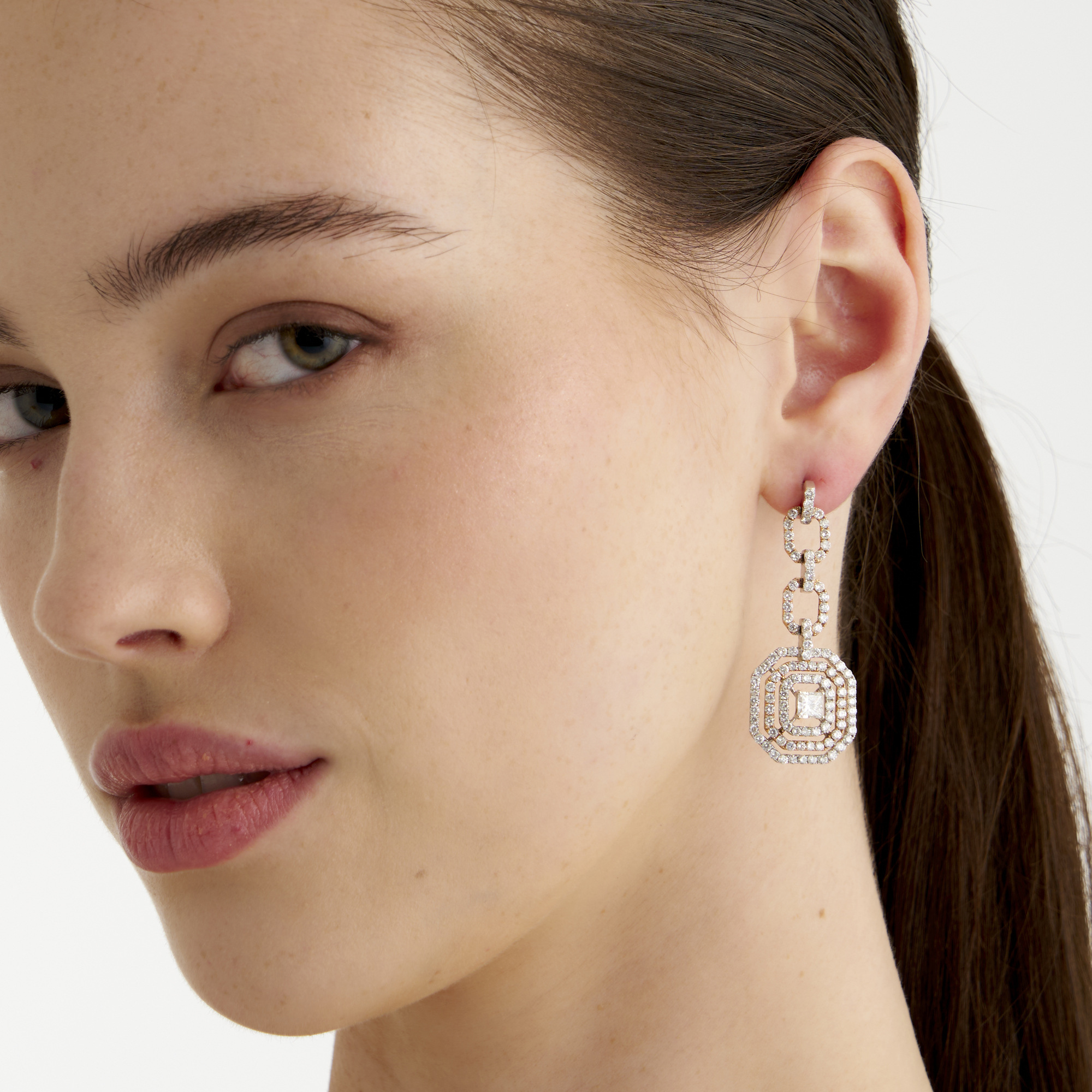 Each earring of cluster design, centring a corner claw-set princess-cut diamond within a triple octagonal surround of claw-set round brilliant-cut diamonds, suspended below a geometric link drop set throughout with further round brilliant-cut diamonds, the diamonds together weighing approximately 4.20 carats, to post and butterfly fittings, length 50mm, gross weight approximately 13.7 grams.
