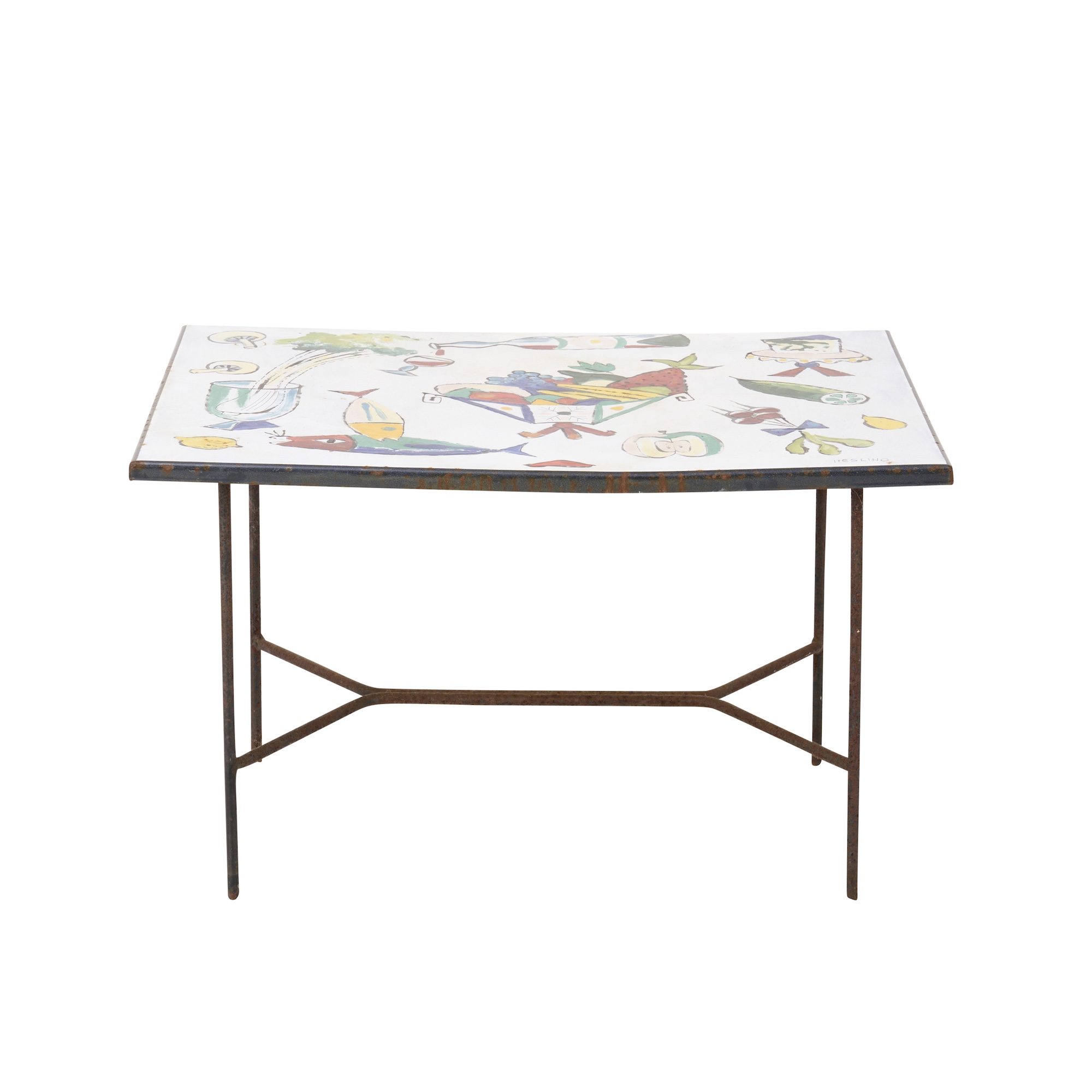 Rectangular top on metal rod legs. Vitreous enamel decoration with polychrome market produce motifs of fruit, fish, vegetables and cheese on white ground. Signed 'Hesling' lower right.