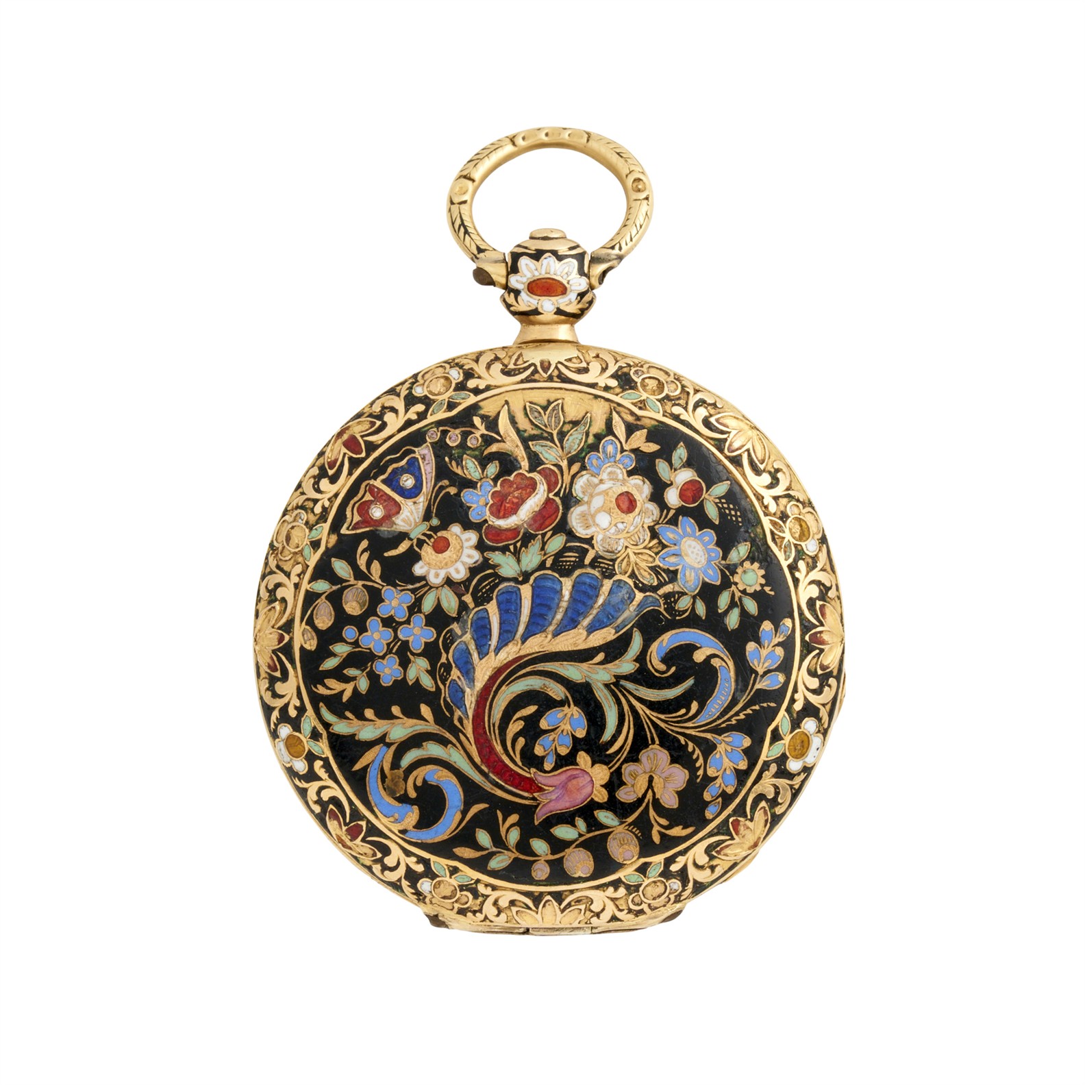 Case: case, bezel and pendant with polychrome enamel floral and foliate decoration some enamel losses