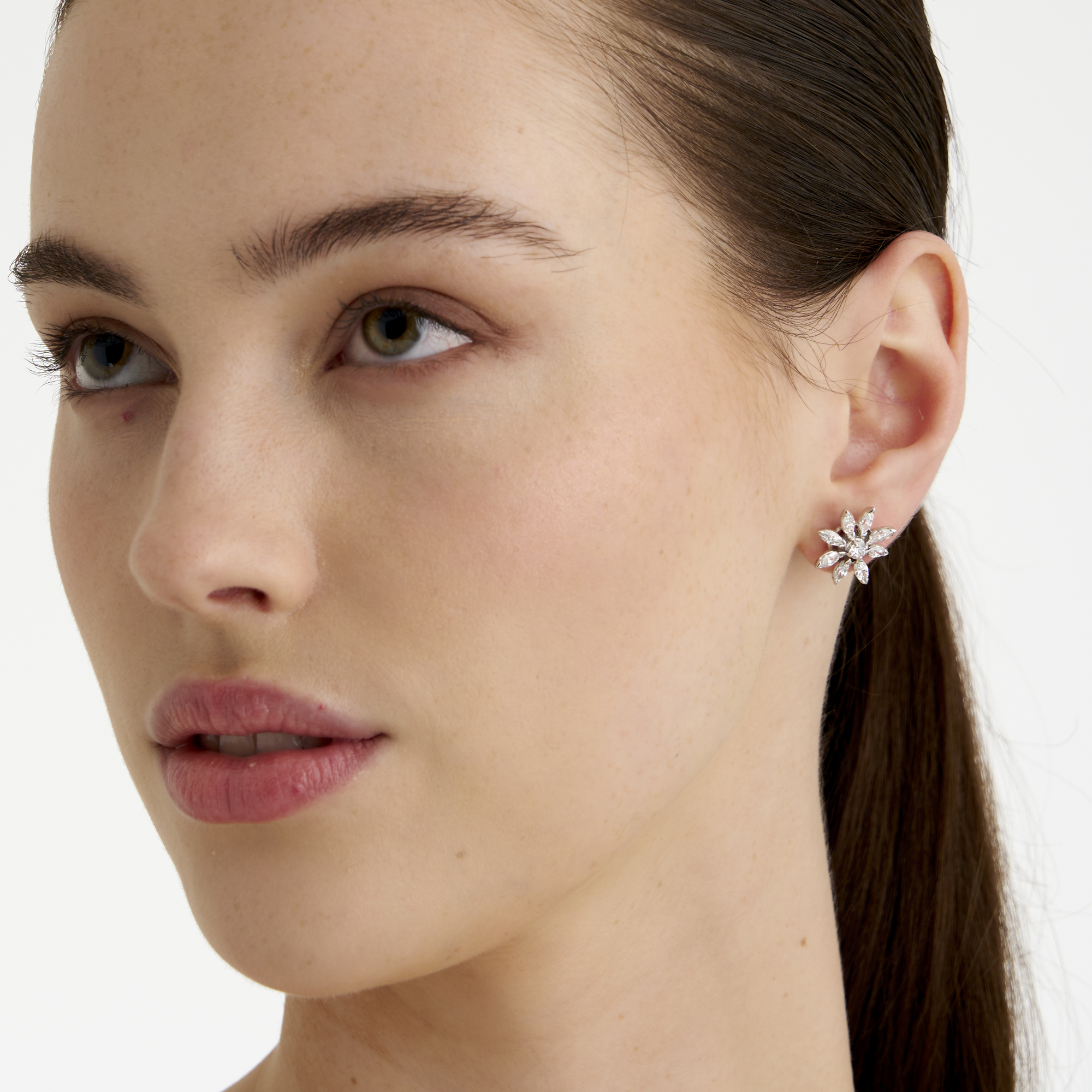 Each earring modelled as a floral cluster, centring a claw-set round brilliant-cut diamond, within a surround of end-set marquise-cut diamonds, the diamonds together weighing approximately 2.12 carats, to post and la pousette fittings, diameter 18mm, gross weight approximately 6.9 grams.