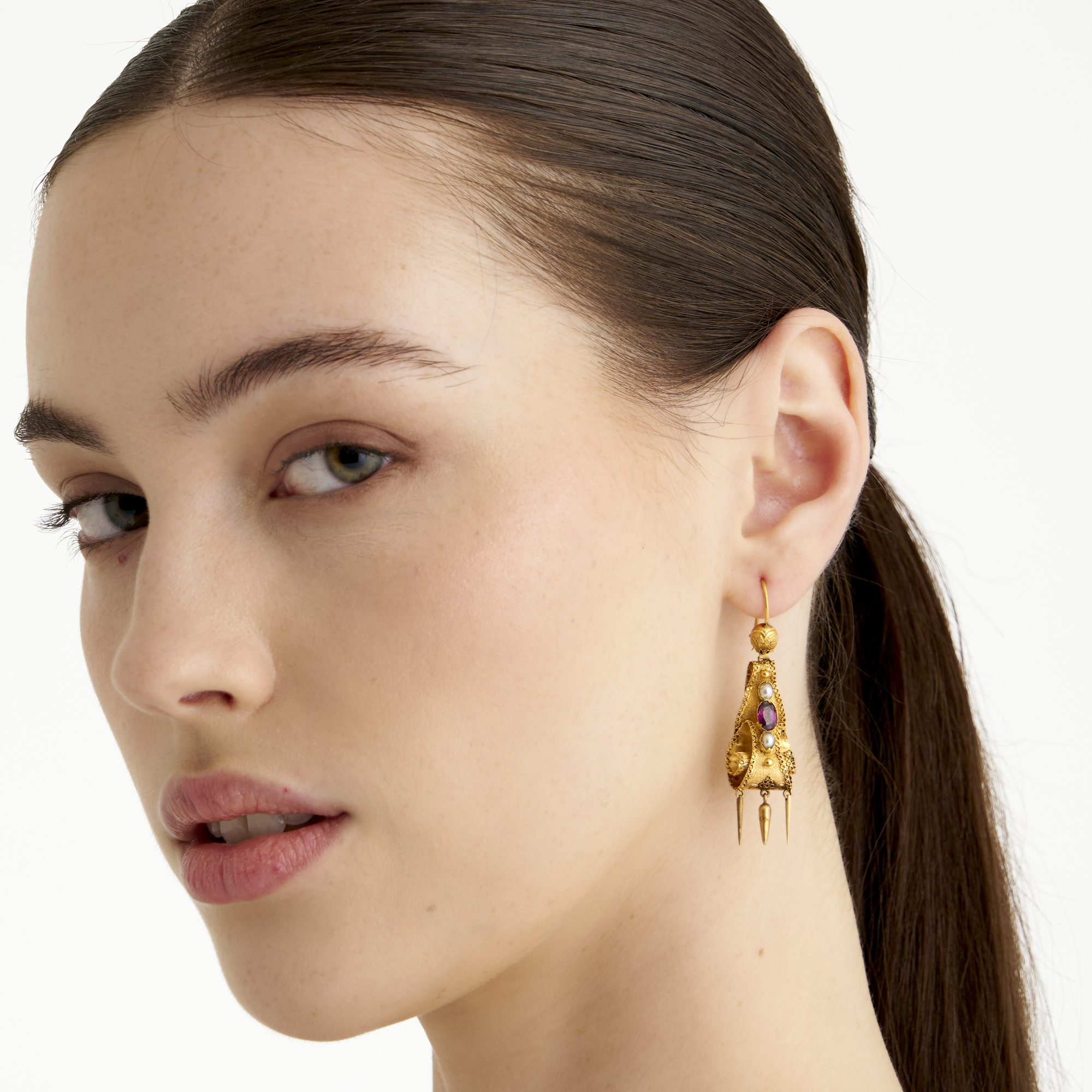 Each earring modelled as a tapered scroll centring a oval garnet flanked by seed pearls and suspending three articulated gold drops, to shepherd hook fittings, length 55mm, gross weight approximately 7.0 grams.