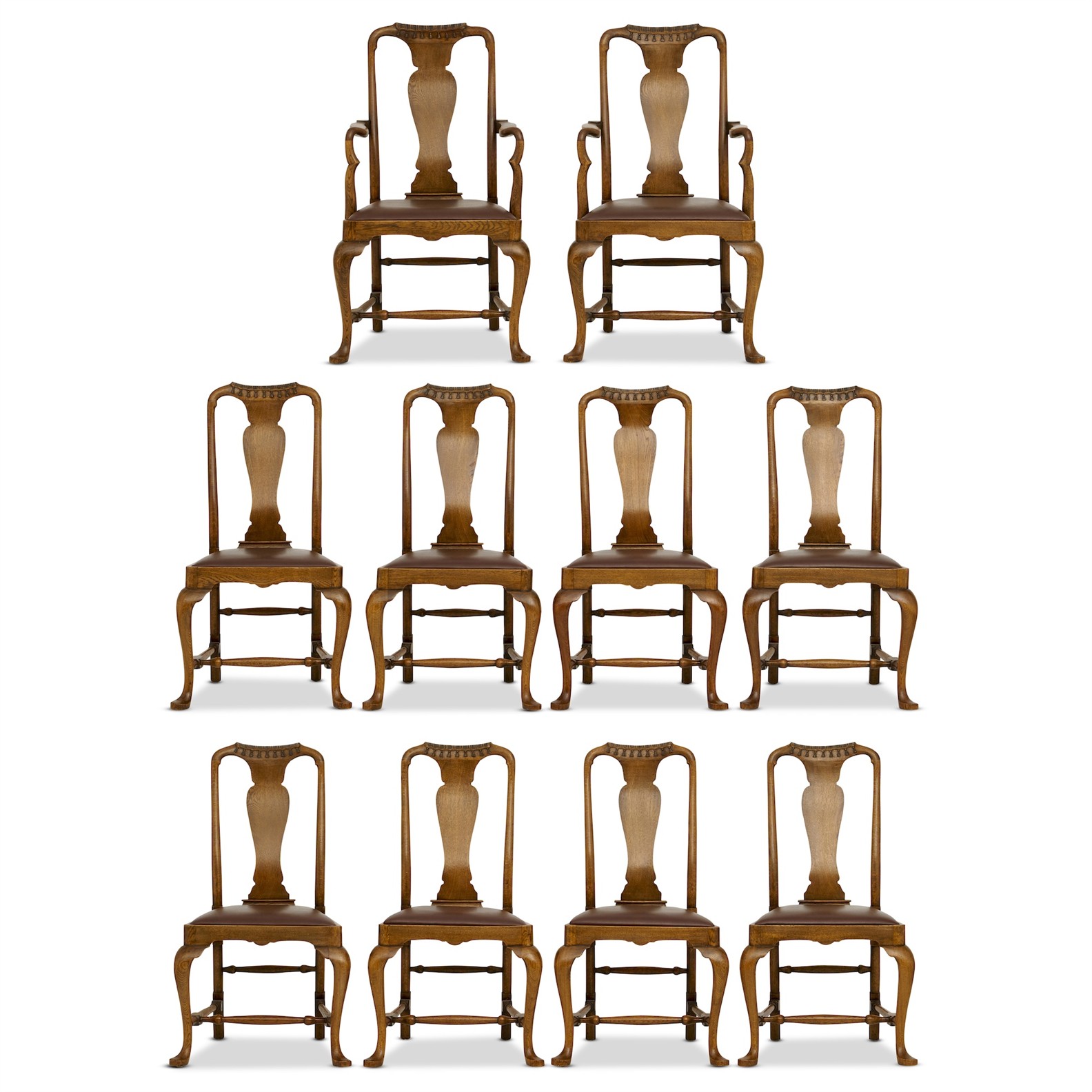 An extending table with rounded ends (the top circular when not extended) raised on cabriole supports with wood casters (with five spare leaves) together with a set of ten chairs in early Georgian manner, including a pair of elbow chairs with shepherd's crook arms