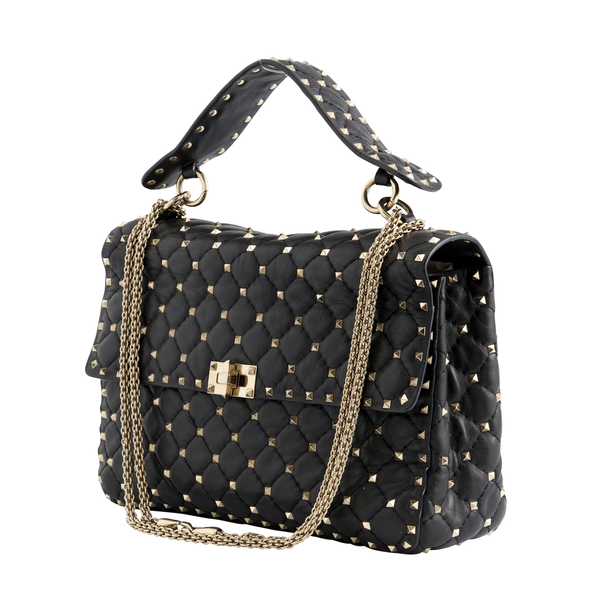 Styled in black quilted nappa leather featuring all over silver tone rockstud embellishments, designed with sliding chain strap, top handle and twist-lock closure, measures 29 x 20 x 8 cm.