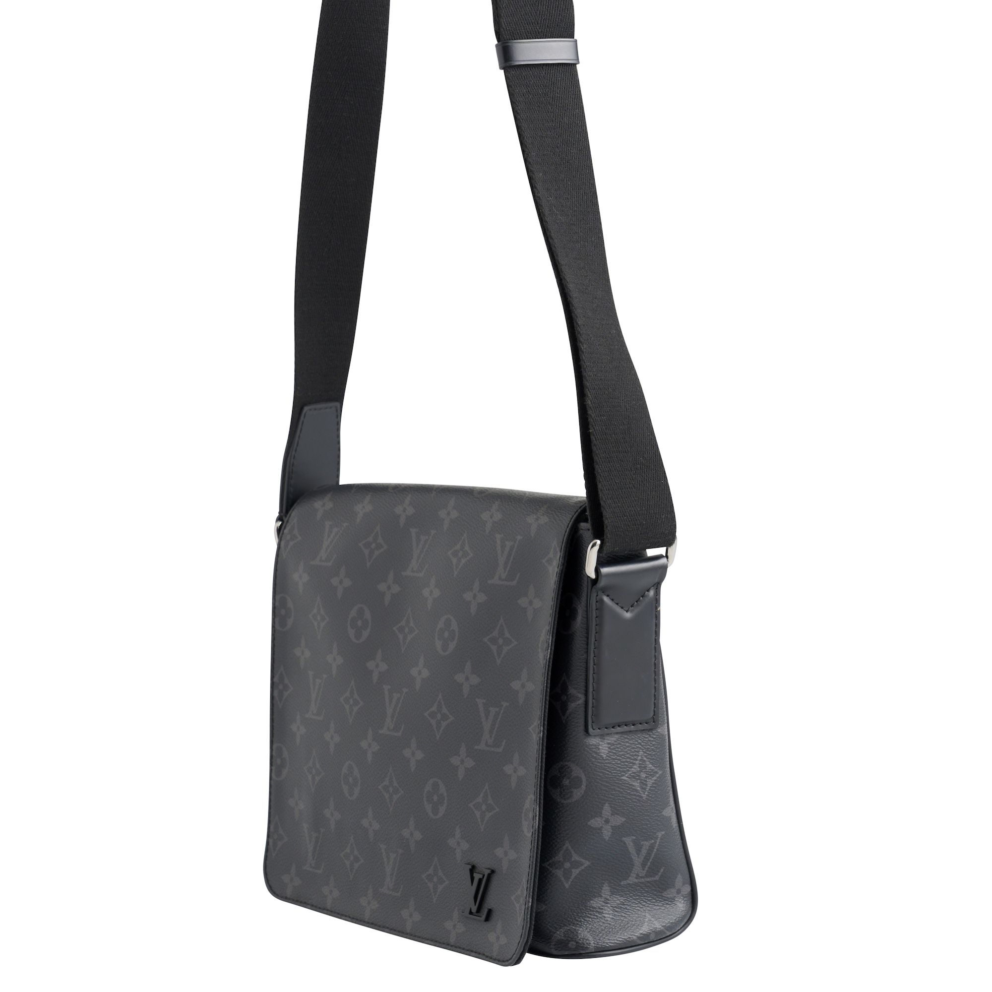 Styled in dark grey monogram coated canvas with black leather trim and coordinating grosgrain strap, measures 22 x 25 x 9 cm.
