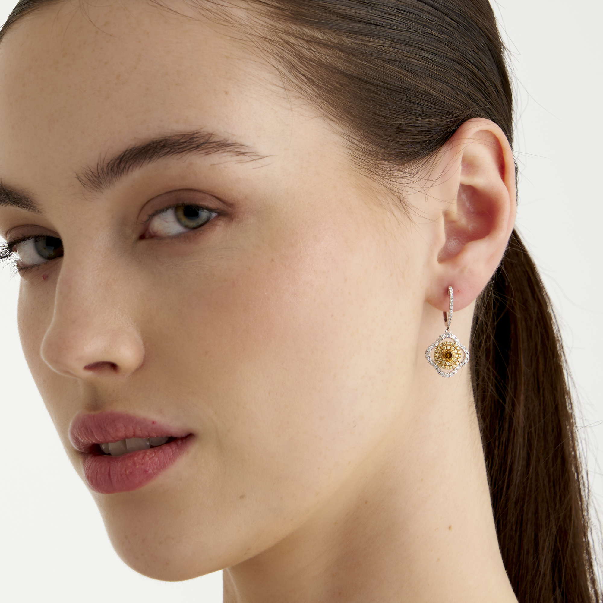 Of cluster design, each earring centring a claw-set round brilliant-cut fancy deep yellow diamond within a double surround of claw-set round brilliant-cut fancy yellow diamonds and a further surround of claw-set diamonds, suspended from a diamond-set hoop, the diamonds together weighing approximately 1.97 carats, to post fittings, length 31mm, gross weight approximately 5.1 grams.