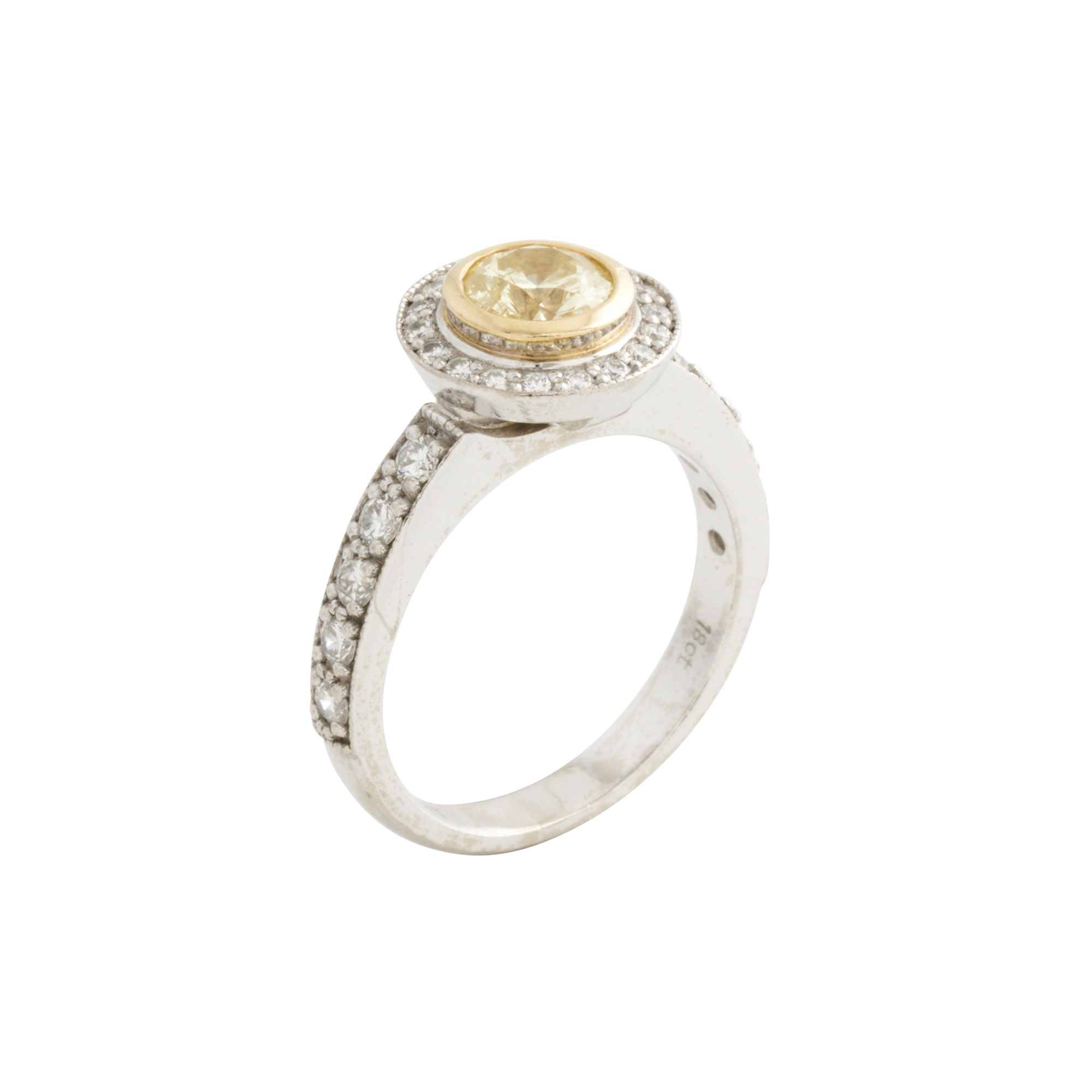 Of cluster design, centring a bezel-set fancy yellow round brilliant-cut diamond weighing approximately 0.75 carats, within a surround and shoulders detailed with bead-set round brilliant-cut diamonds together weighing approximately 0.48 carats, signed Anton, size L, gross weight approximately 6.5 grams.