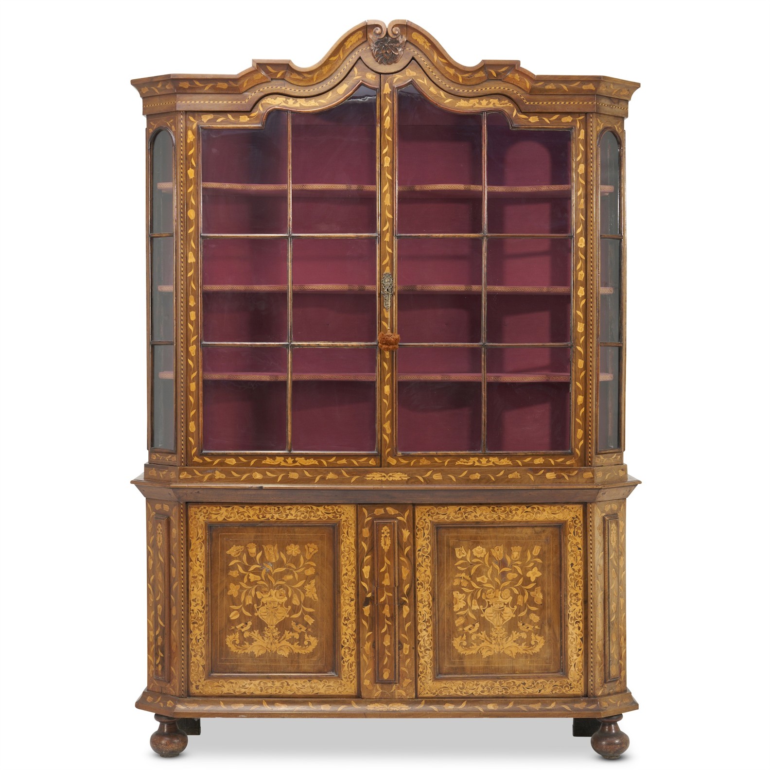AN ANTIQUE DUTCH WALNUT AND MARQUETRY BOOKCASE CABINET
