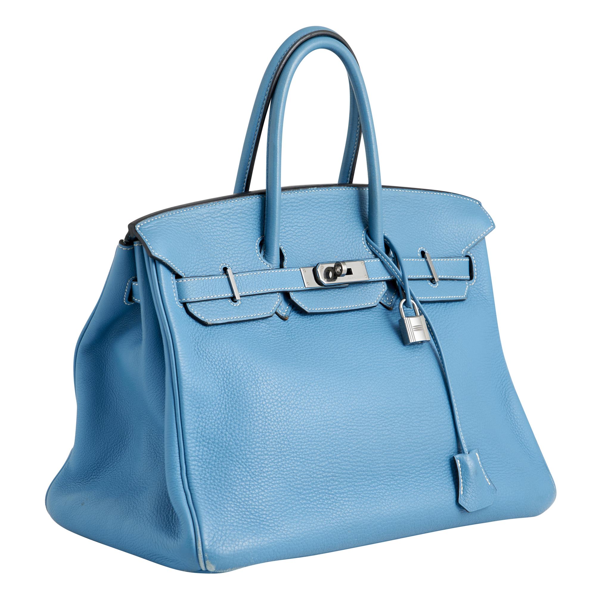 Styled in blue jean togo leather with palladium hardware and contrast white stitching, accompanied by clochette and keys, measures 35 x 25 x 18cm.