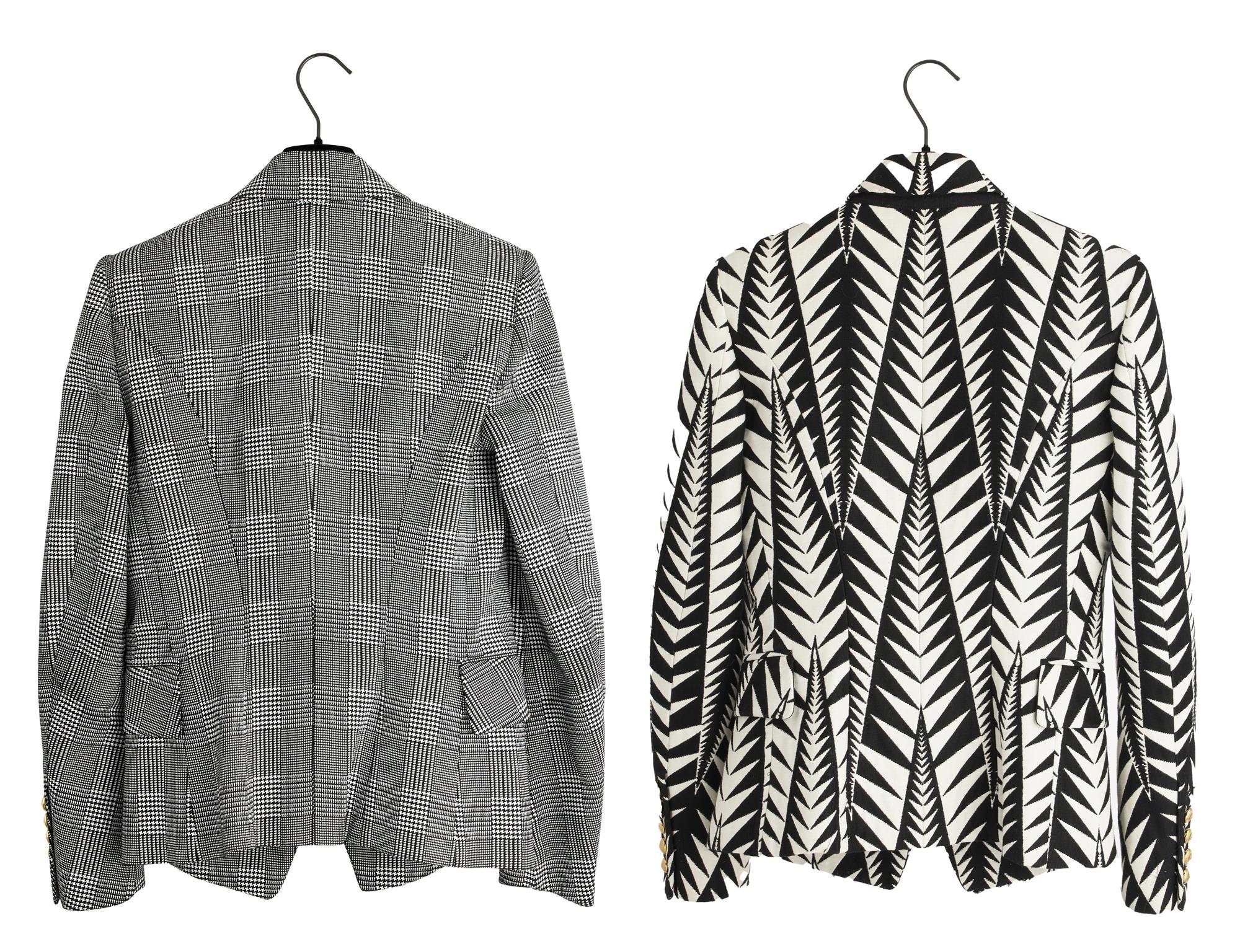 Comprising Prince of Wales check blazer tailored in black and white cotton blend; together with a black and white Chevron jacquard blazer in cotton blend, both marked size 38.