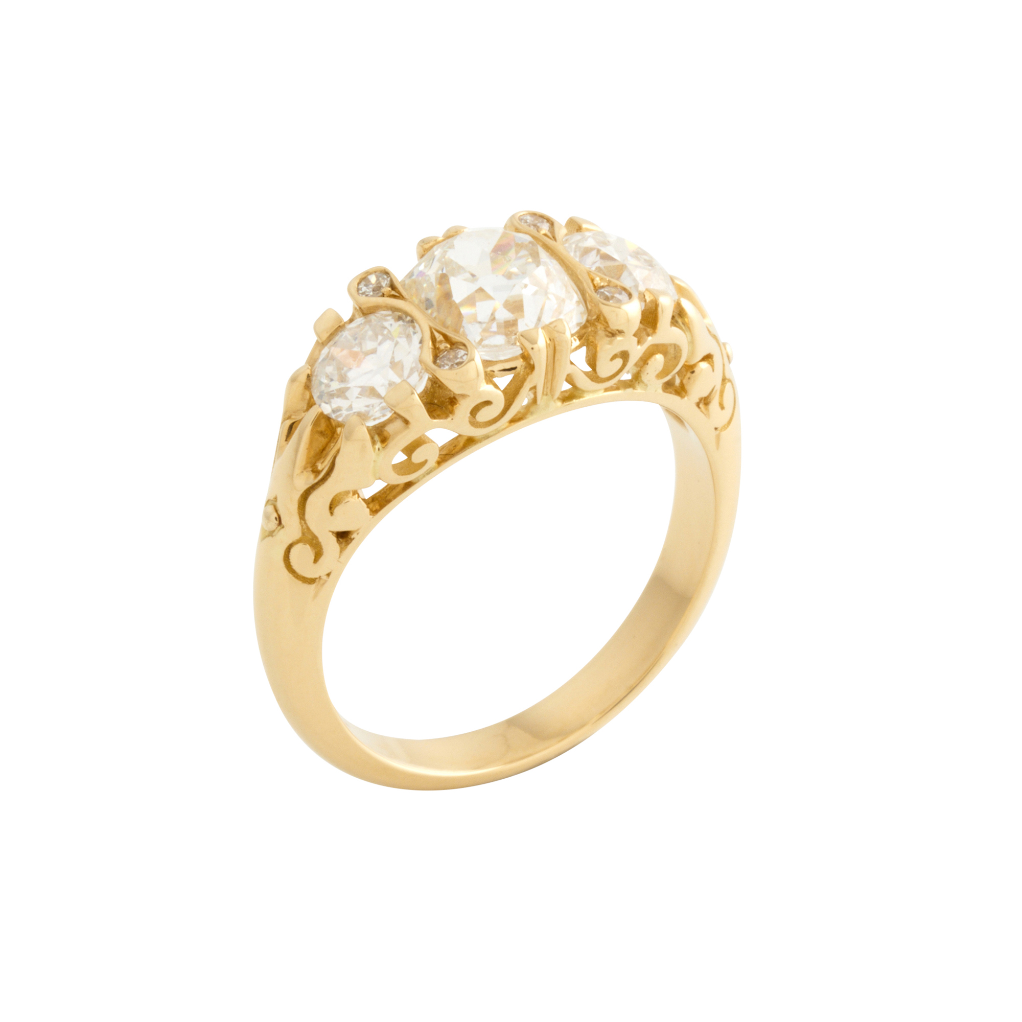 Centring a claw-set old cushion-cut diamond weighing 1.48 carats, flanked by claw-set old European-cut diamonds together weighing approximately 1.00 carat, decorated between with four further old European-cut diamonds together weighing approximately 0.04 carats, with filigree details to underbezel, size M, gross weight approximately 5.1 grams.