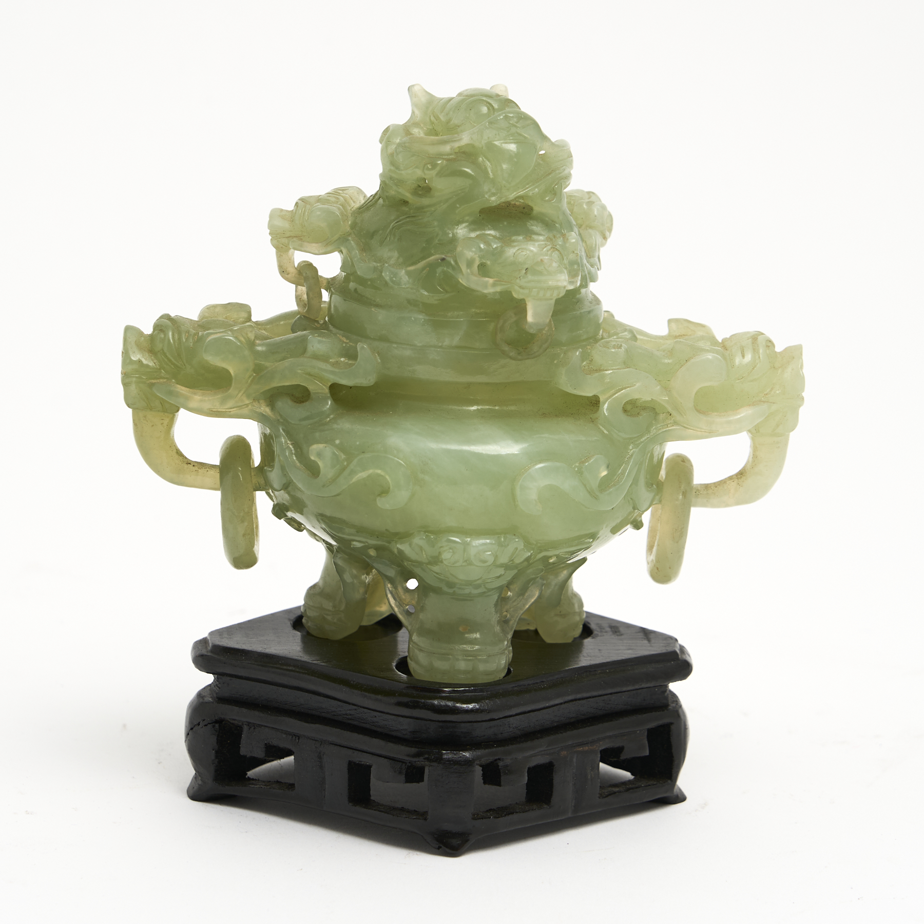 A CARVED HARDSTONE LIDDED CENSOR WITH TWIN LION HANDLES, SET ON A FITTED WOODEN BASE H.17CM