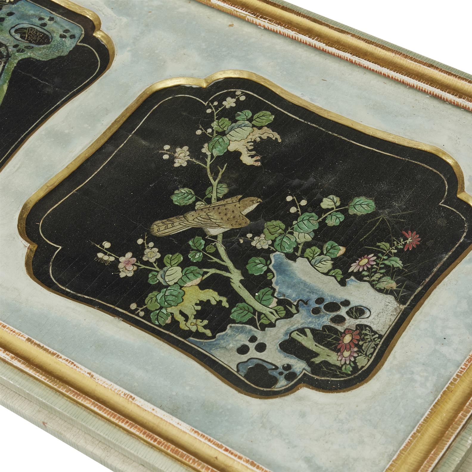 Of rectangular form with moulded edge enclosing two 18th century black lacquer and polychrome Chinese panels of flowers, one with a bird, on a 20th century base with square legs headed by pierced fretwork brackets.