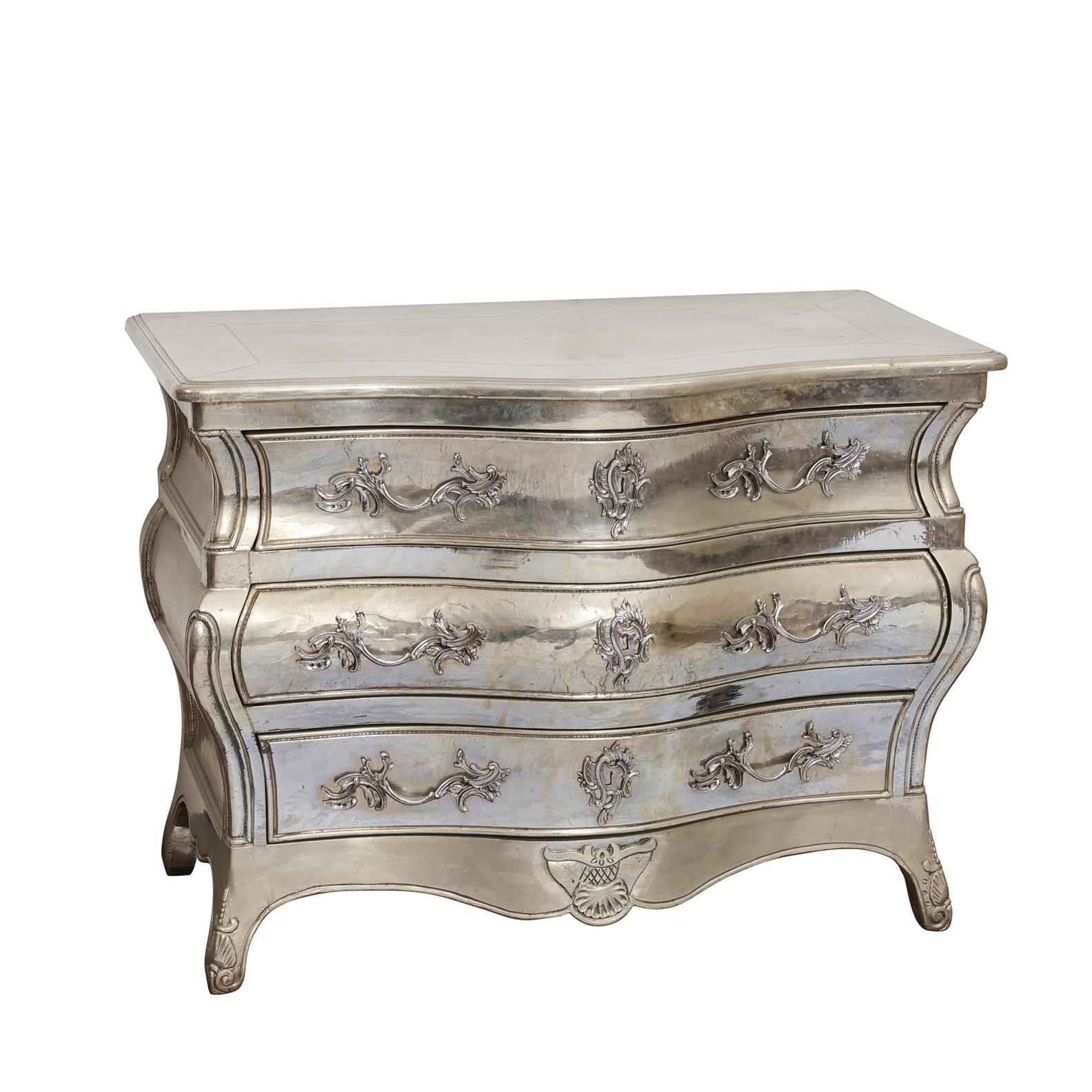 20th century, of bombé outline with three long drawers on scroll feet.