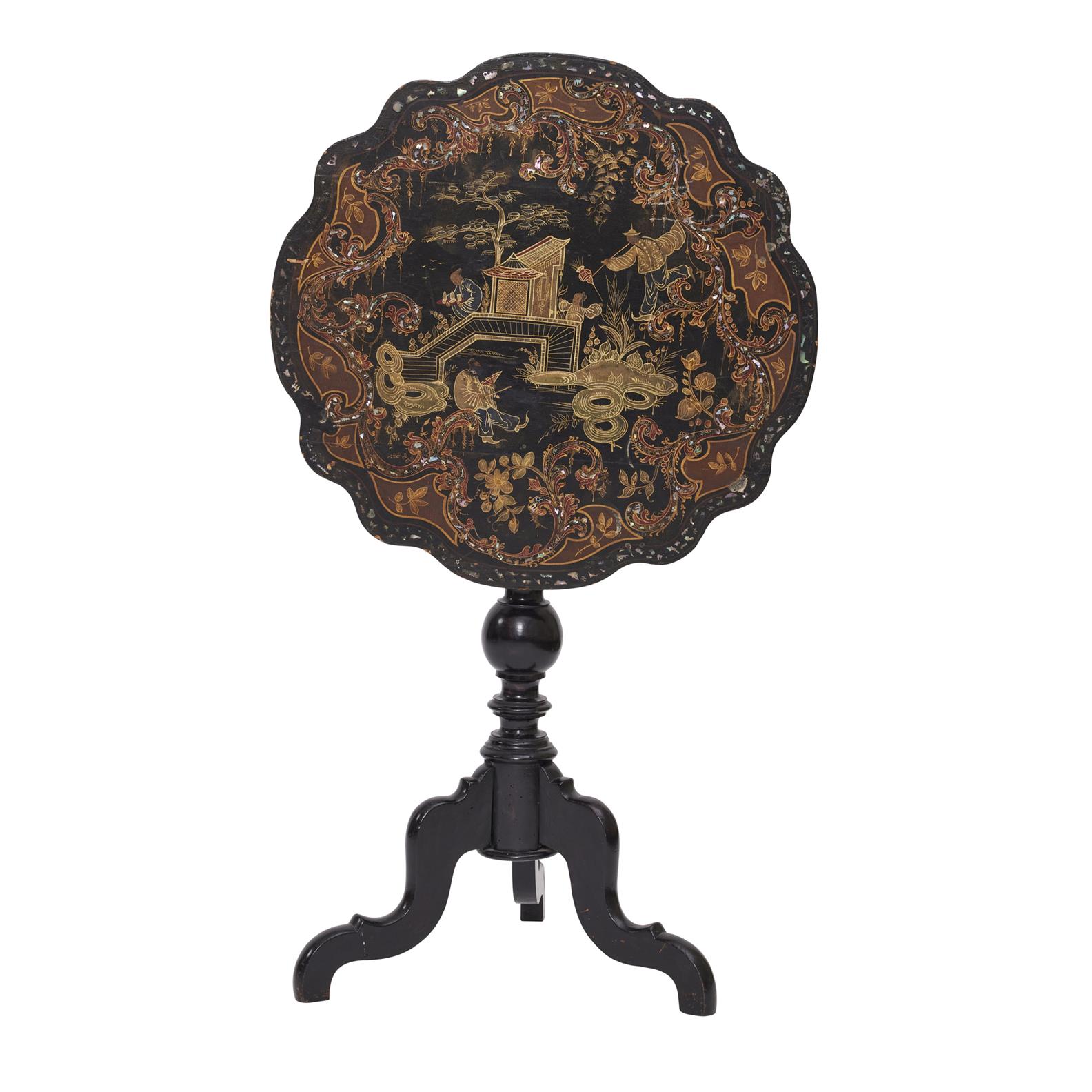 A BLACK JAPANNED, CHINOISERIE DECORATED AND MOTHER OF PEARL INLAID OCCASIONAL TABLE
