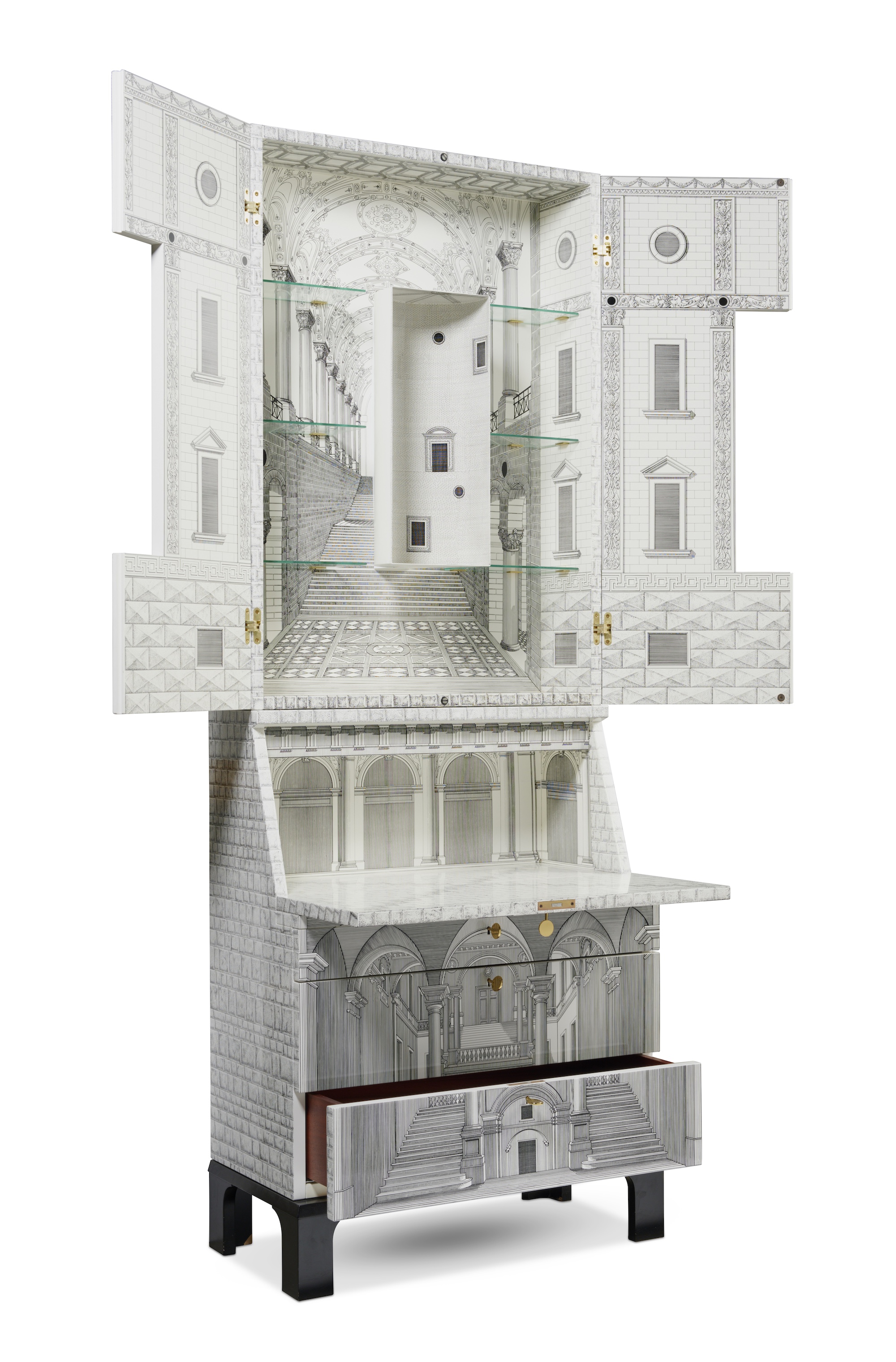 Hand-silkscreened and lacquered with black and white architectural trompe l'oeil scenes. Three drawers, double door, and drop down desk with brass keys, hinges and door pulls.