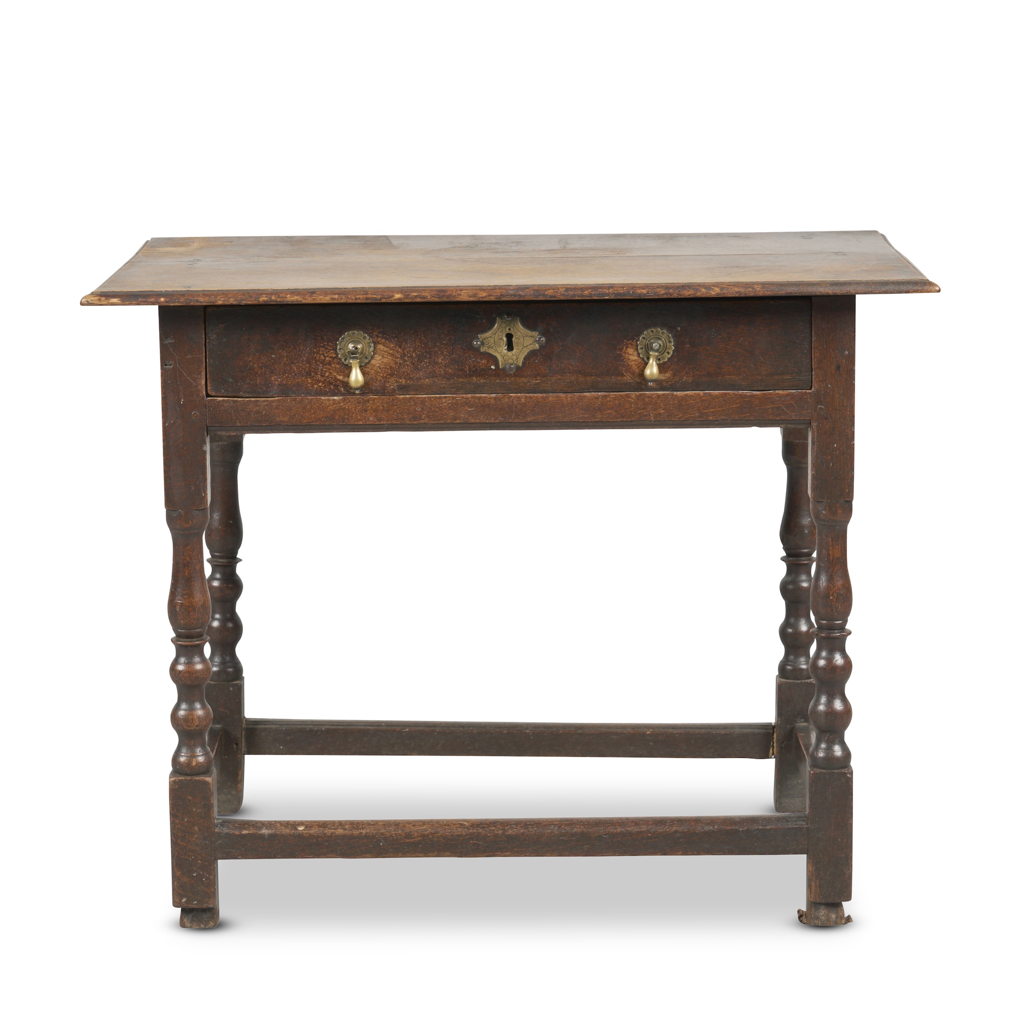 The rectangular top above a frieze drawer, on turned and block supports joined with peripheral stretchers
