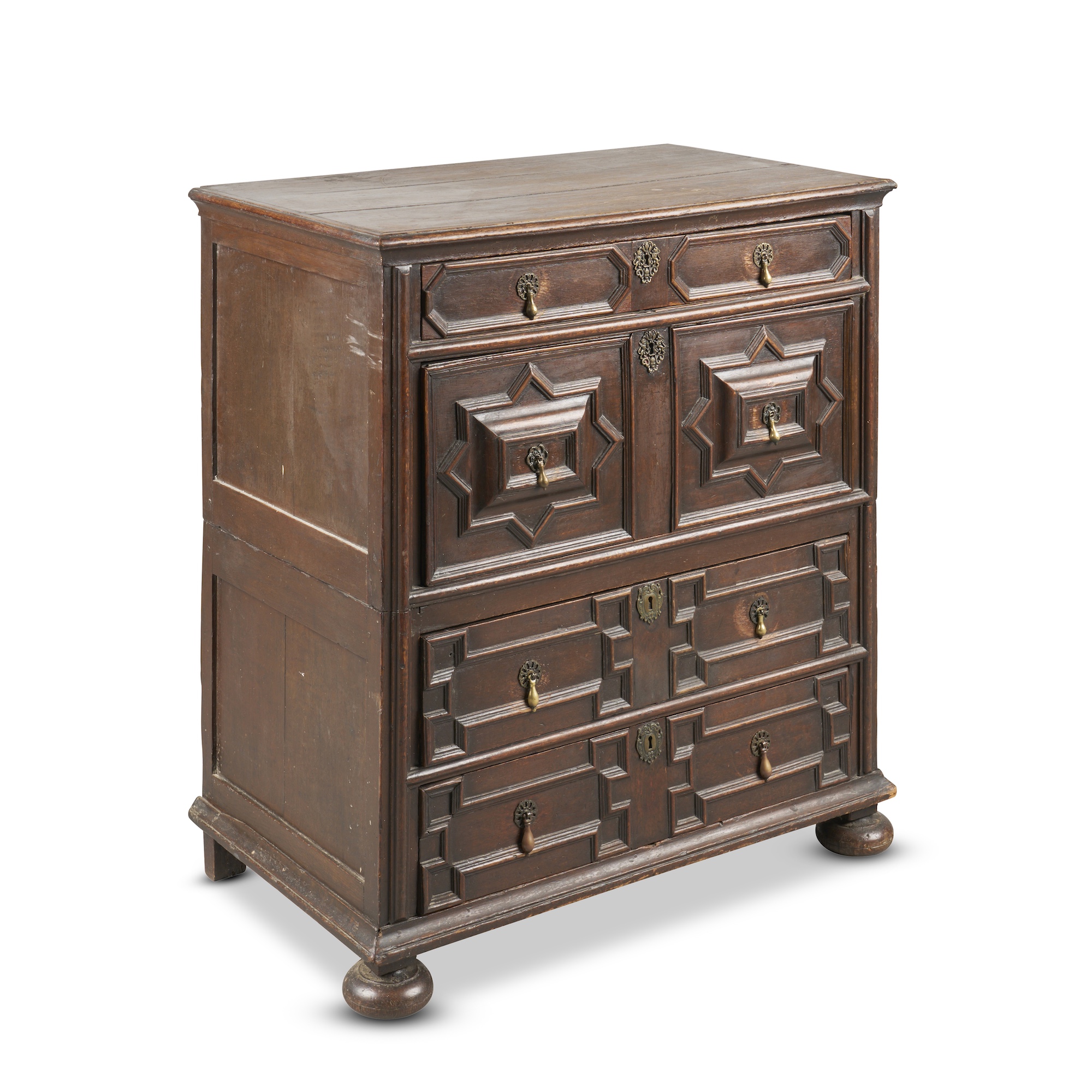 In two parts, the top with moulded edge above four long drawers of various heights, on bun feet to the front, the drawer fronts geometrically panelled with mouldings within broad astragal mouldings to the front of the carcase, the sides panelled