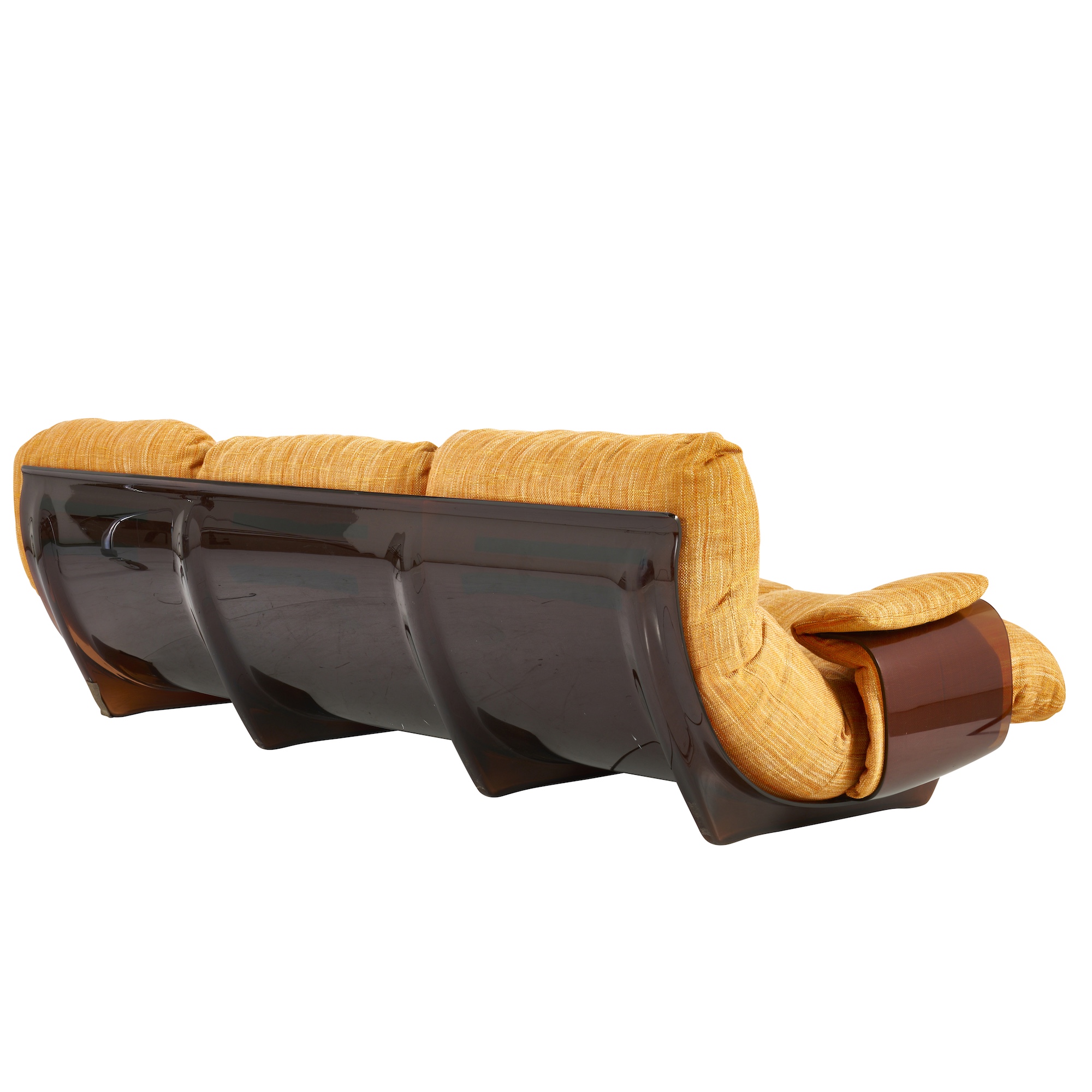 Thermoformed brown plastic shell with integrated base and armrests support cushioning in a woven orange button back textile upholstery. Low deep seat posture.