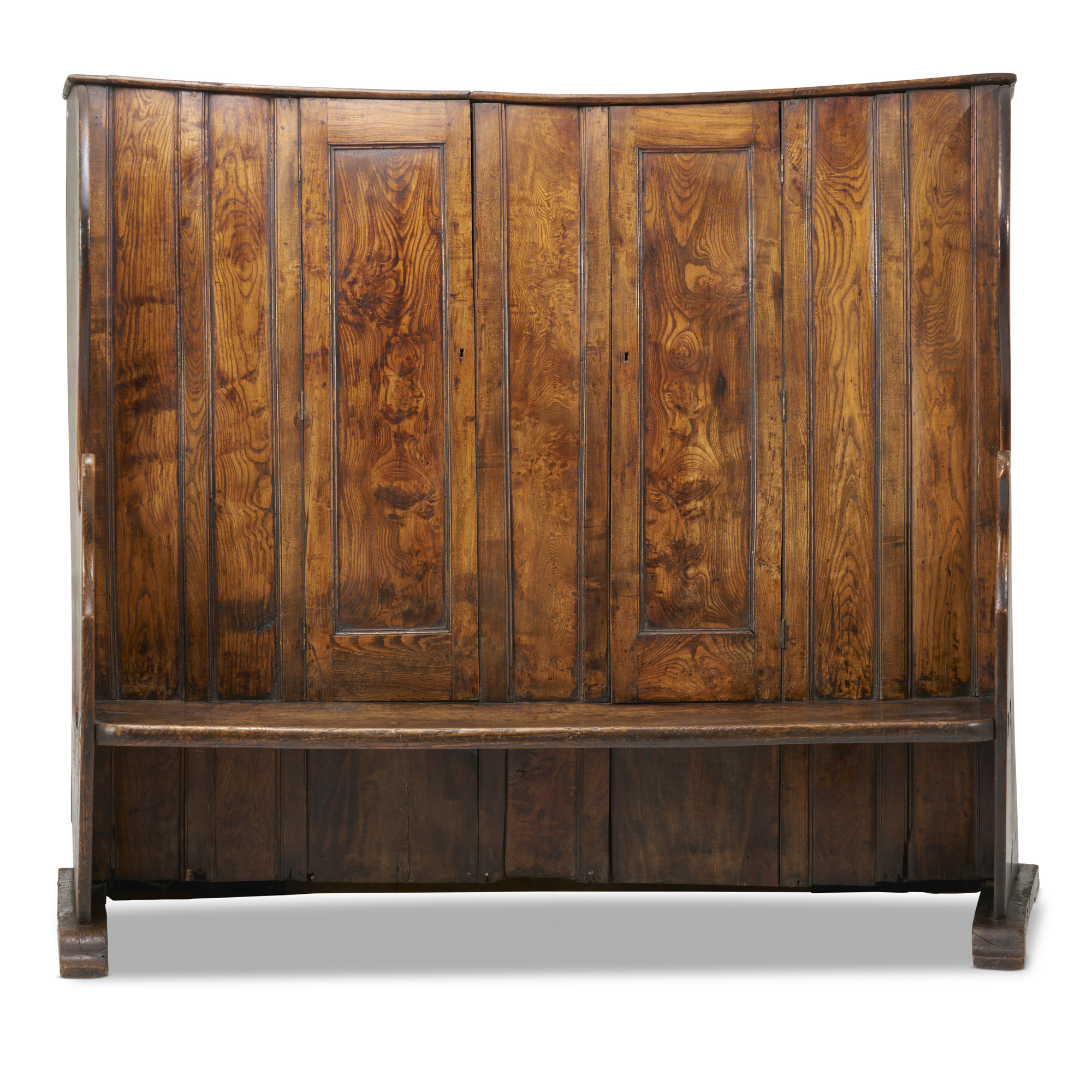 Of slightly concave outline, the high panelled back with two doors enclosing a shallow full-width hanging compartment above the seat between shaped sides, on sled feet