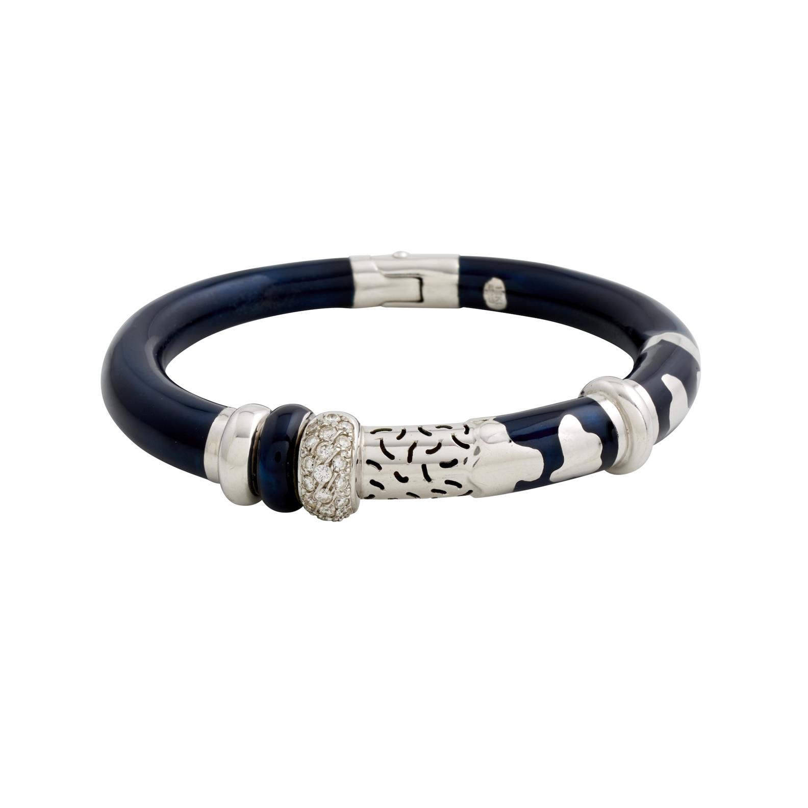 The oval hinged dark blue lacquer bangle, is completed by a pavé-set diamond clasp, the diamonds together weighing 0.44 carats, mounted in 18ct white gold, inner circumference 165mm, gross weight approximately 33.9 grams.