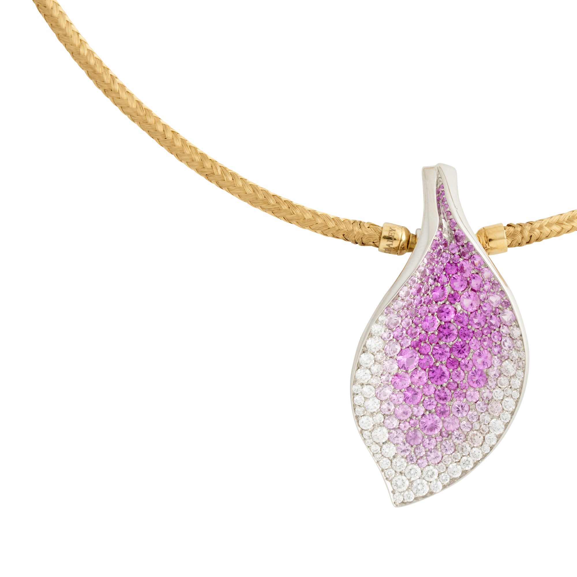 The clasp/pendant pavé-set throughout with forty-one round brilliant-cut diamonds, twenty fancy pink round brilliant-cut diamonds and one hundred thirty-five circular-cut sapphires all in graduating pink hues, suspended from a chalif chain completed by push clasps, both signed Paspaley, pendant length 47mm, width 26mm, chain length 420mm, gross weight approximately 36.5 grams.