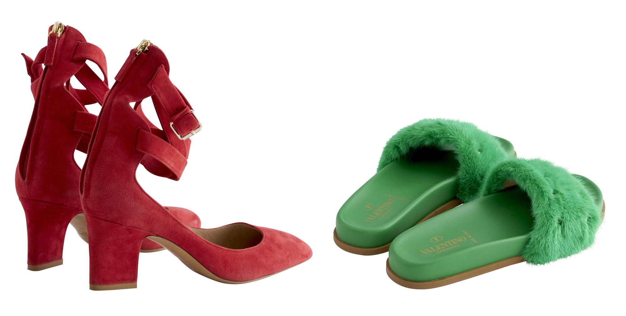 Comprising of a pair green slides styled in mink fur and leather featuring signature pyramid stud detail, marked size 37; together with a pair of red suede ballerina shoes styled in red suede leather designed with multiple straps at ankle, marked size 37.