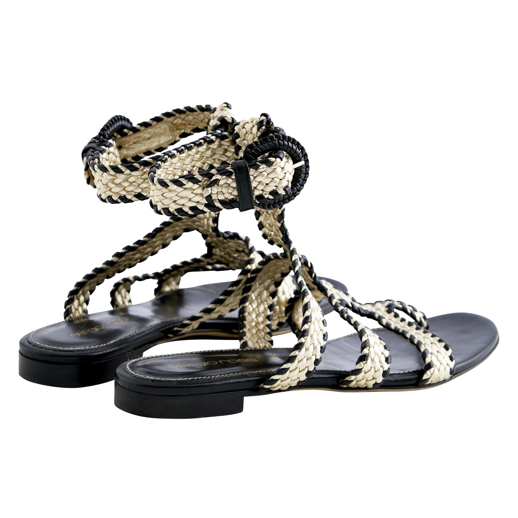 Styled in black and metallic gold braided leather with multi strap design, marked size 37.
