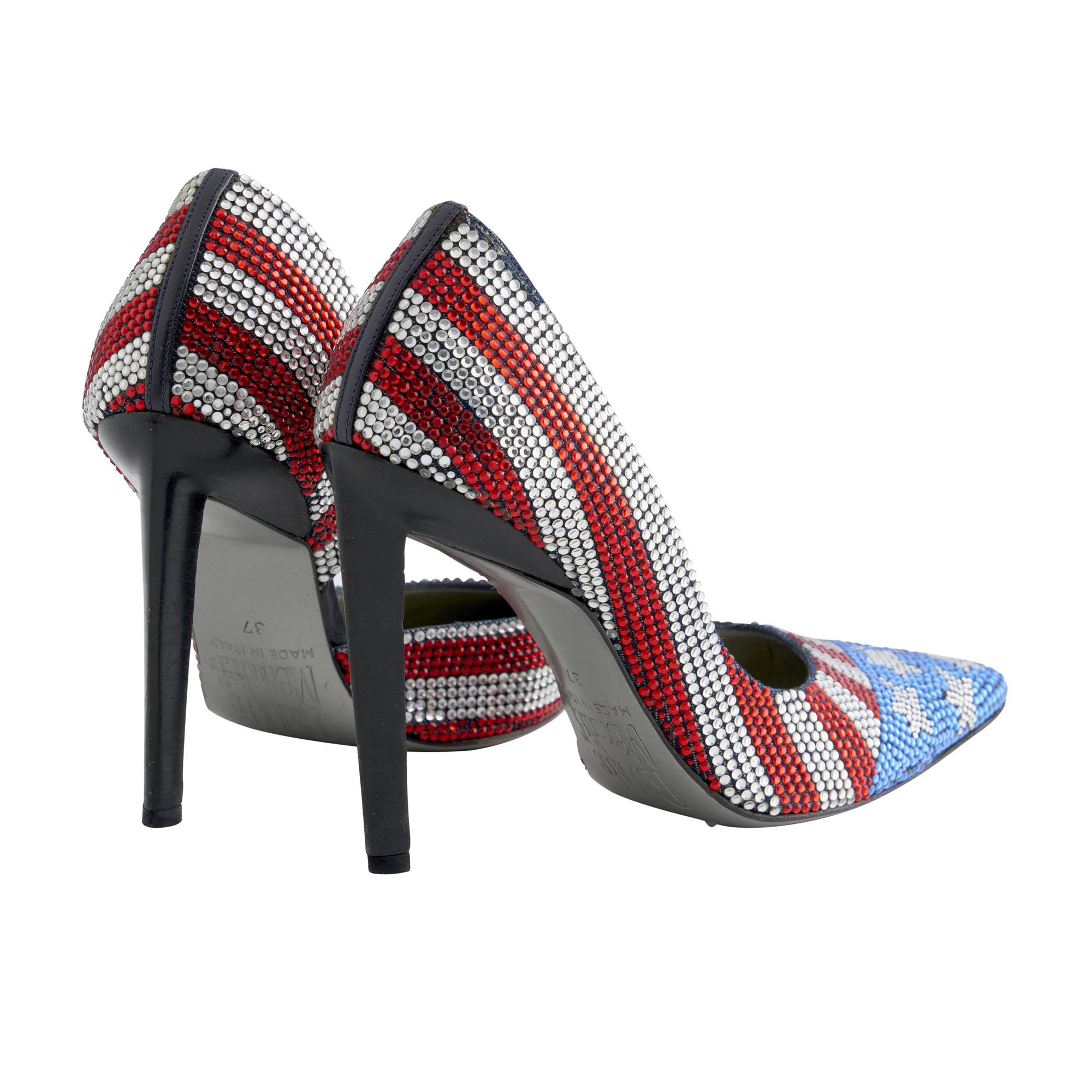 Styled in leather and embellished with red, blue, and silver crystals in an American flag motif, designed with stiletto heel measuring 9cm, marked size 37.