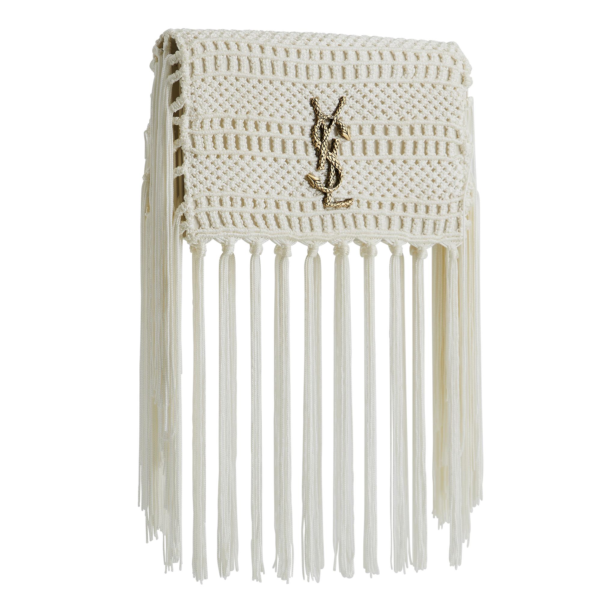 Styled in ivory leather with intricate crochet overlay featuring fringe detail and antique gold tone serpentine YSL logo, measures 21 x13 x 4cm.