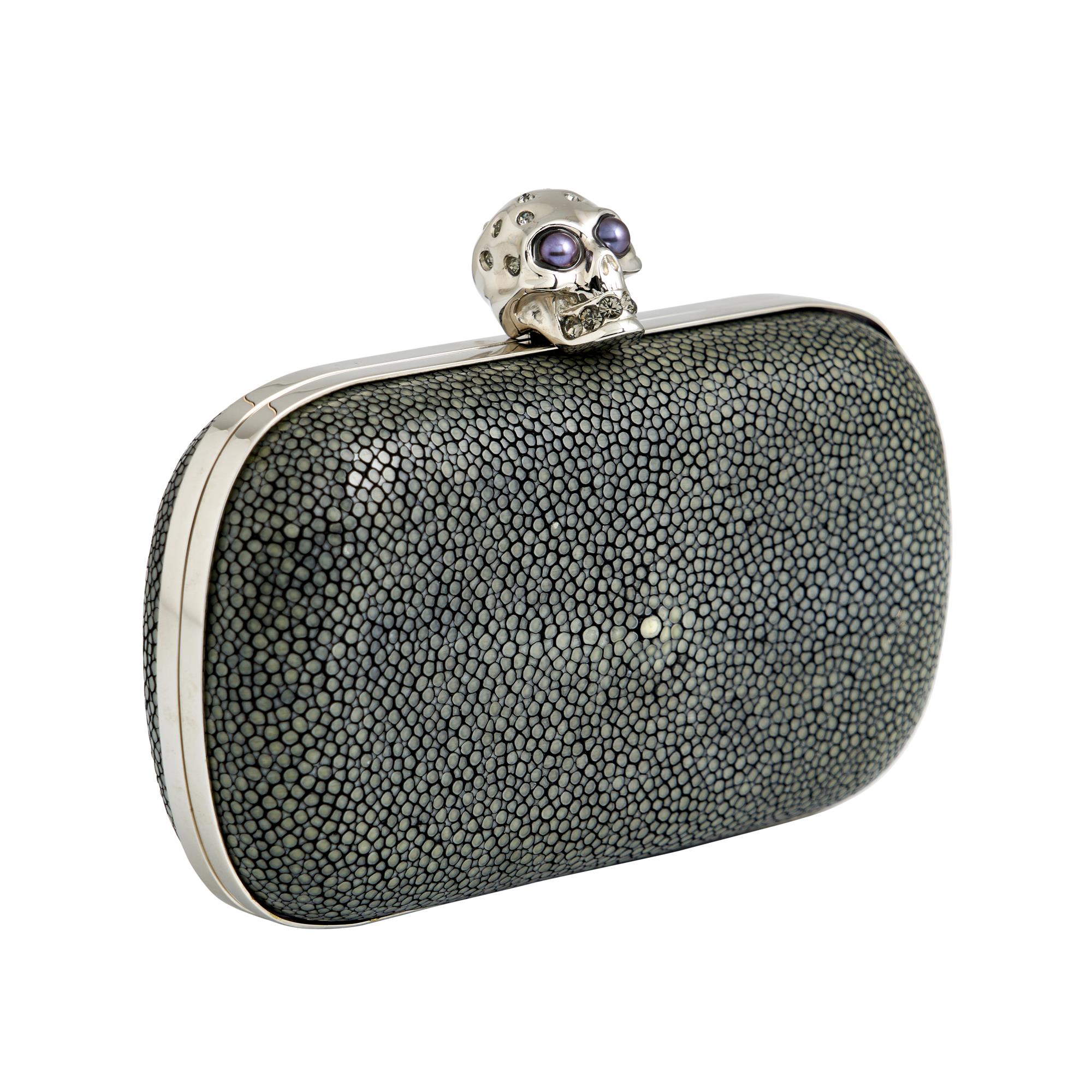 Styled in stingray leather with pebble texture, featuring silver tone skull clasp closure with faux pearl set eyes and crystal detail, measures 15 x 9 x 3cm.