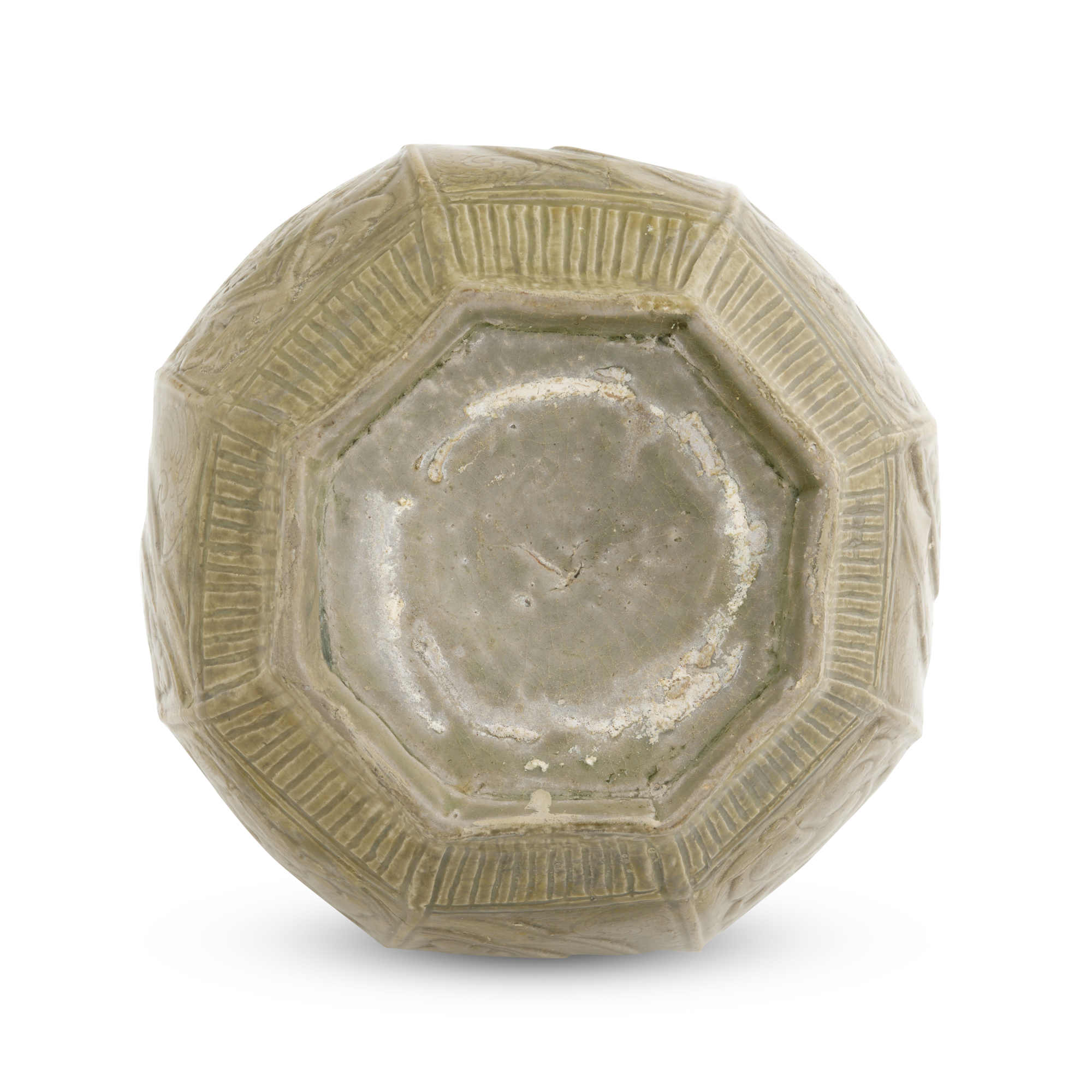 The octagonal section jar decorated with shaped reserves containing sprays of peony blossom and foliage, surrounded by incised scrolling foliage, with incised lotus petal design around the neck. The whole covered in a olive-grey-green coloured glaze. Pontil marks to the base from the firing.