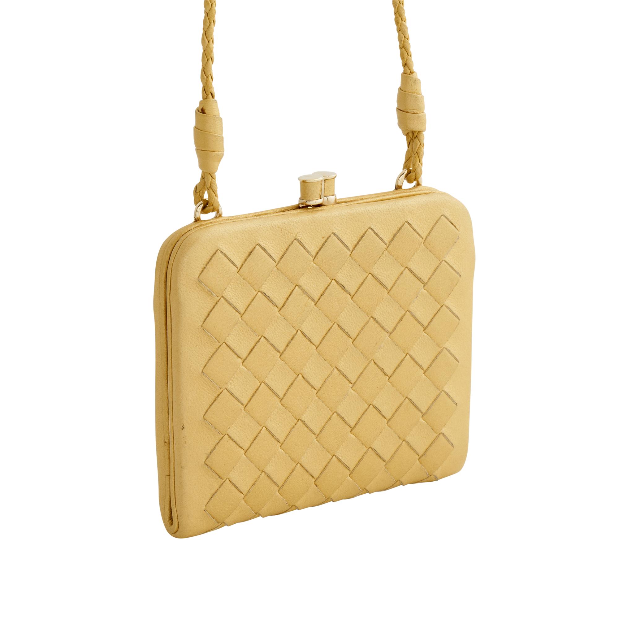 Styled in gold coloured leather featuring house's signature intrecciato weave, framed clasp closure, gold tone hardware and a fine braided leather strap, measures 10 x 9 x 1cm.