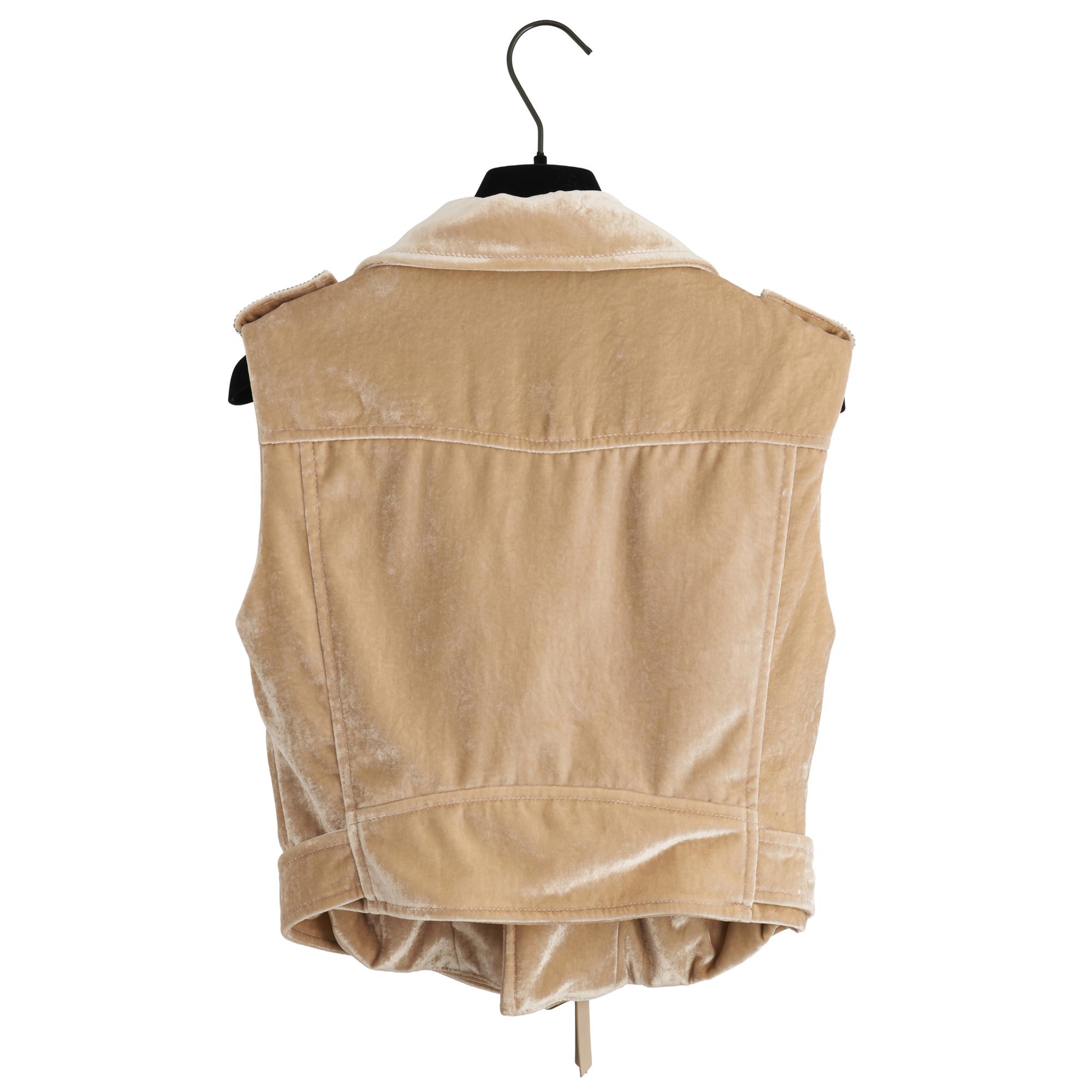 Styled in sand-beige plush velvet with notched lapels and snap studs, asymmetric front zip, twin zipped chest pockets and hip pocket, and a buckle belt at the hem, silver tone hardware, marked size S.