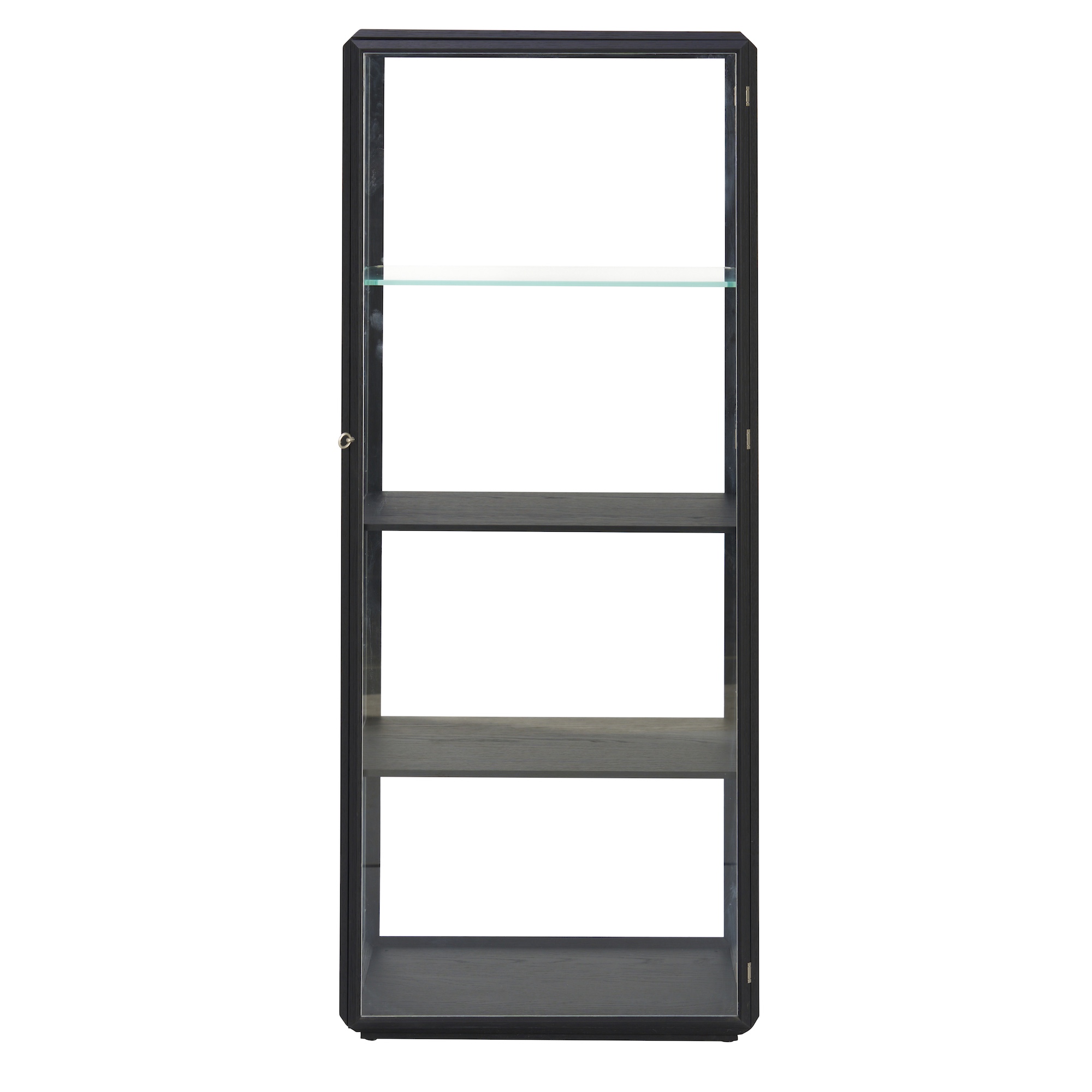 Scratches and small markings on display shelves from use. Paint residue to the top of the cabinet. Presents well overall.