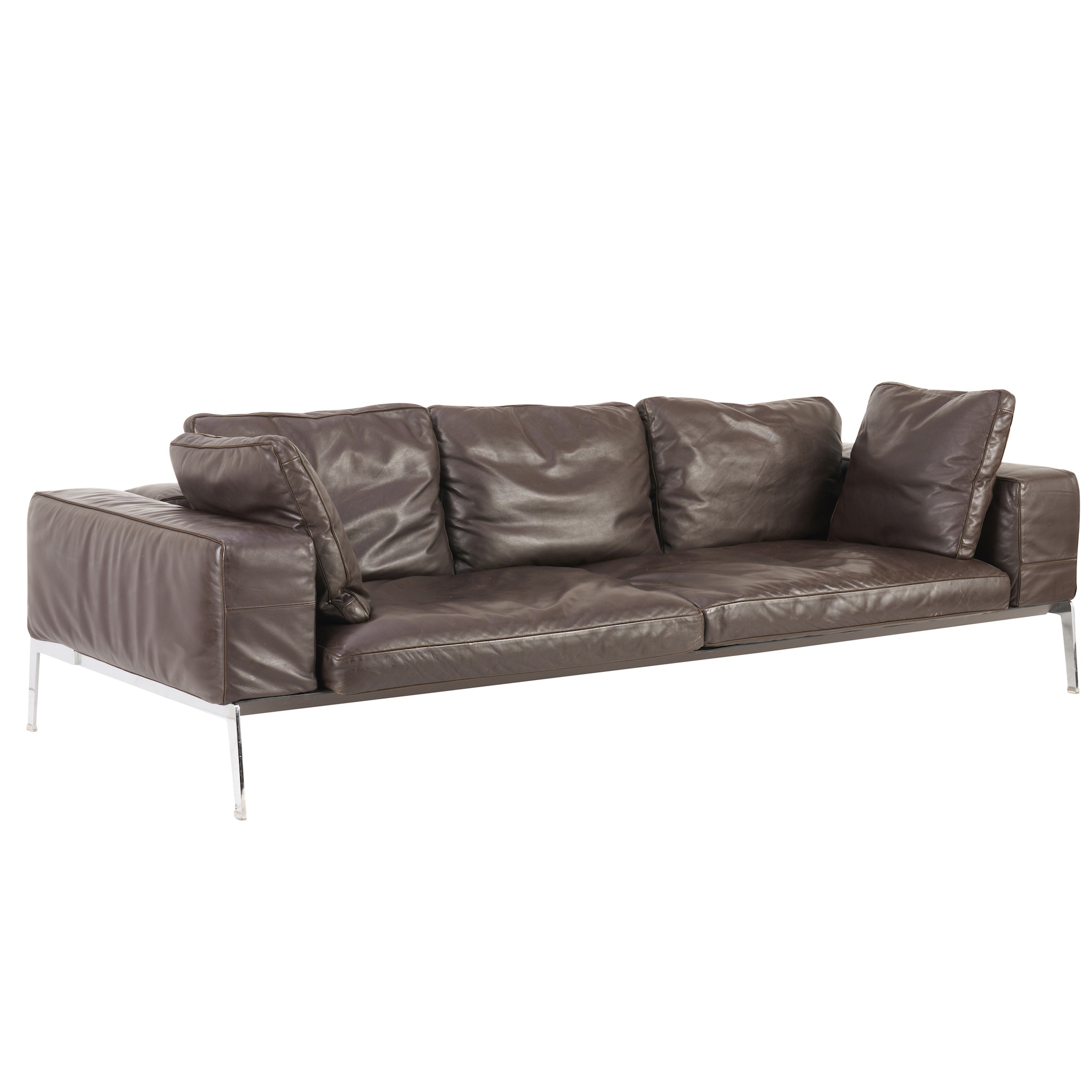 Chocolate leather upholstered goose down cushions with bolster detail to backrests. Deep seats with generously proportioned armrests. Frame and legs in polished steel.