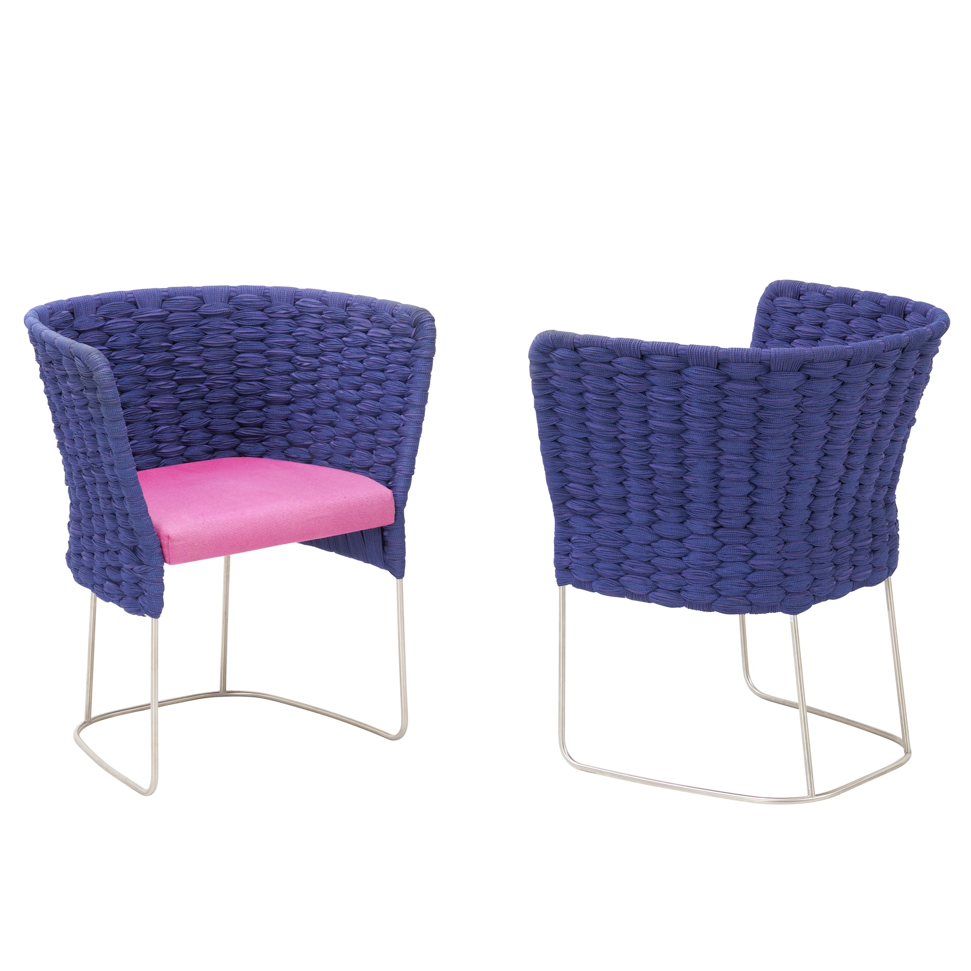 Woven textile bucket seats in purple with fuchsia seats on stainless steel bases.