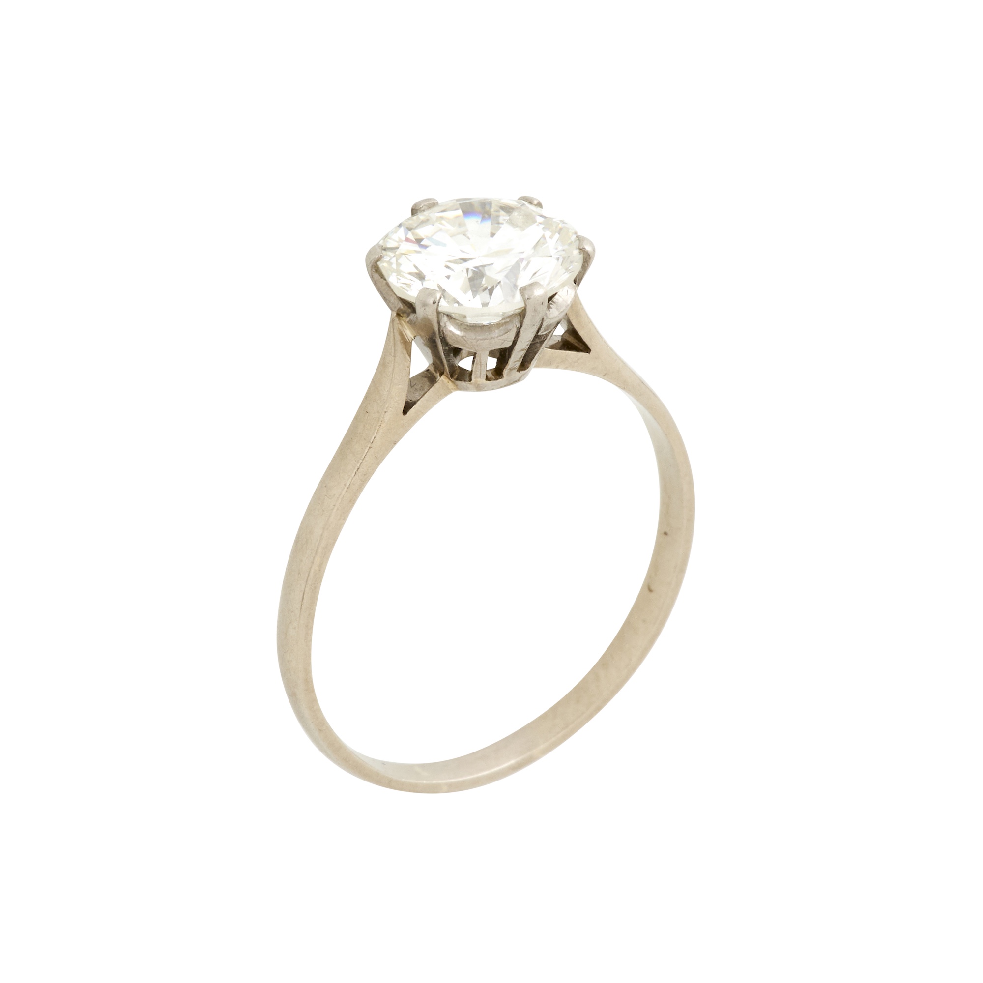 Centring a claw set round brilliant cut diamond weighing approximately 2.50 carats, size R, gross weight approximately 2.80 grams.
