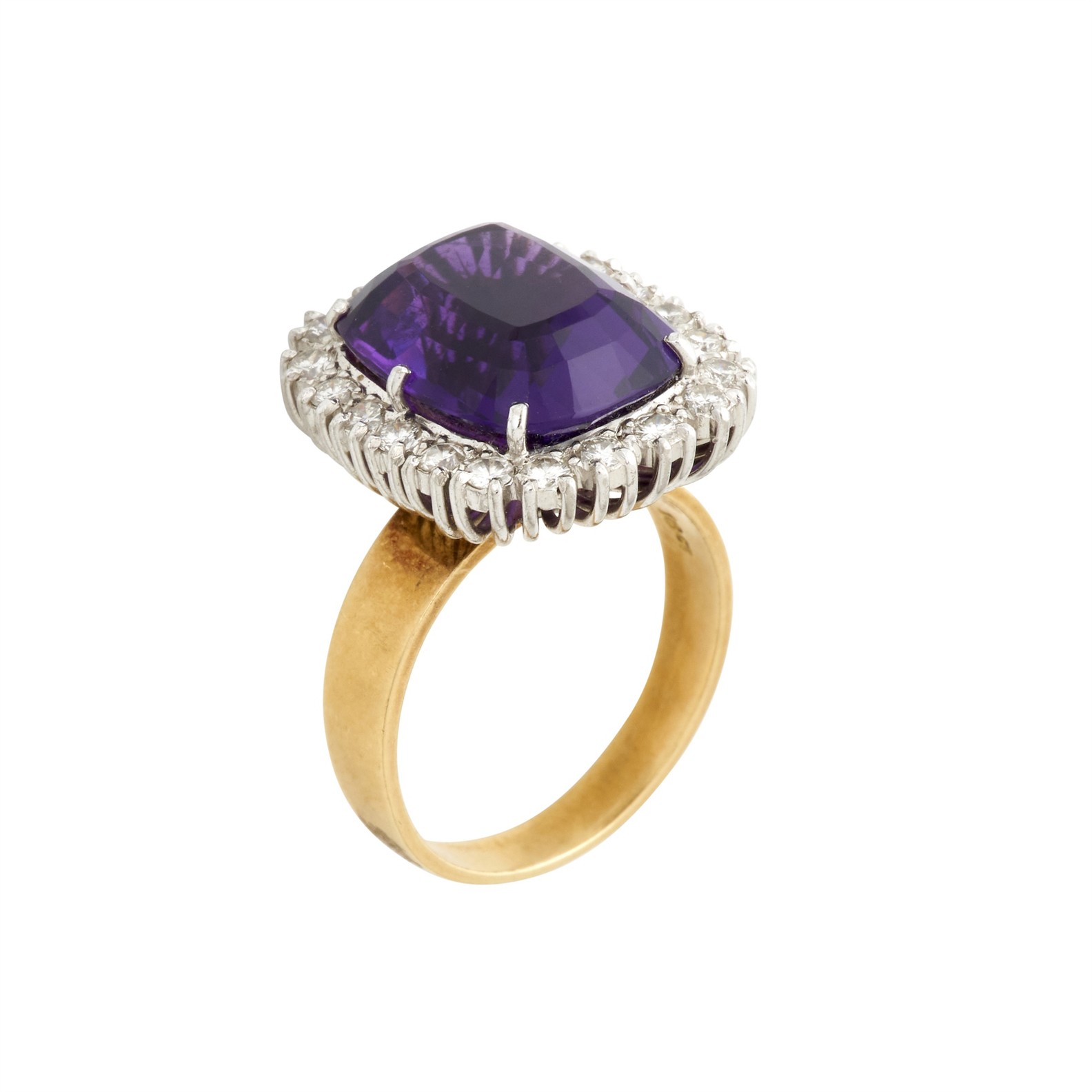 AN AMETHYST AND DIAMOND RING IN TWO TONE 18CT GOLD, THE AMETHYST WEIGHING APPROXIMATELY 11CTS, THE DIAMONDS TOTALLING 0.60CTS, SIZE P, TOTAL WEIGHT 8.40GMS