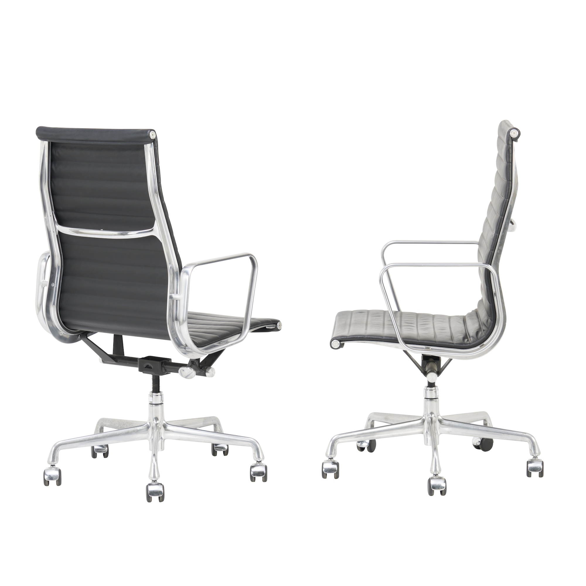Both chairs in good structural condition with only very light wear to upholstery. The aluminium armrests have noticeable wear and patina, loss of finish to arm rests. Swivel mechanism and castors working.