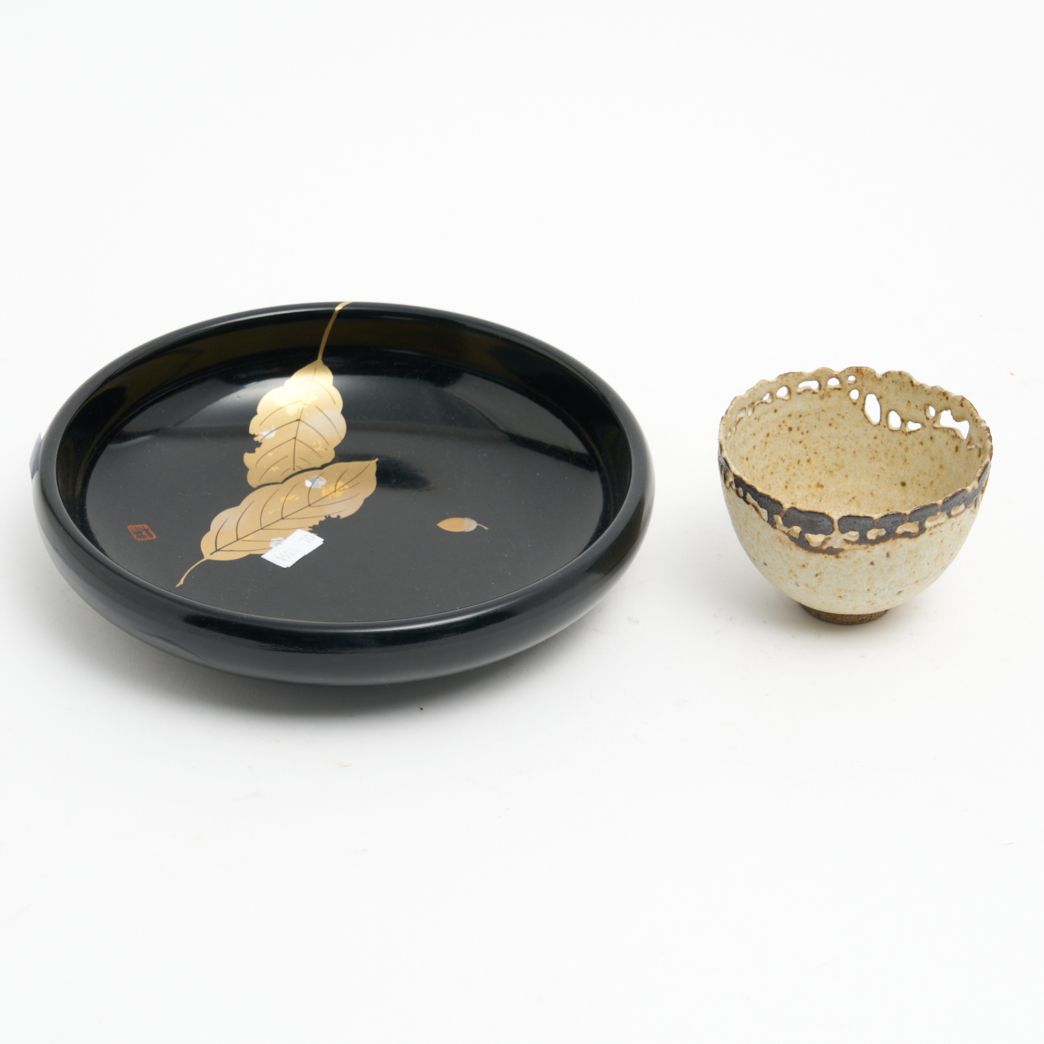 A JAPANESE LACQUERED PLATE TOGETHER WITH A SMALL CERAMIC BOWL DIA.22CM (LARGEST)